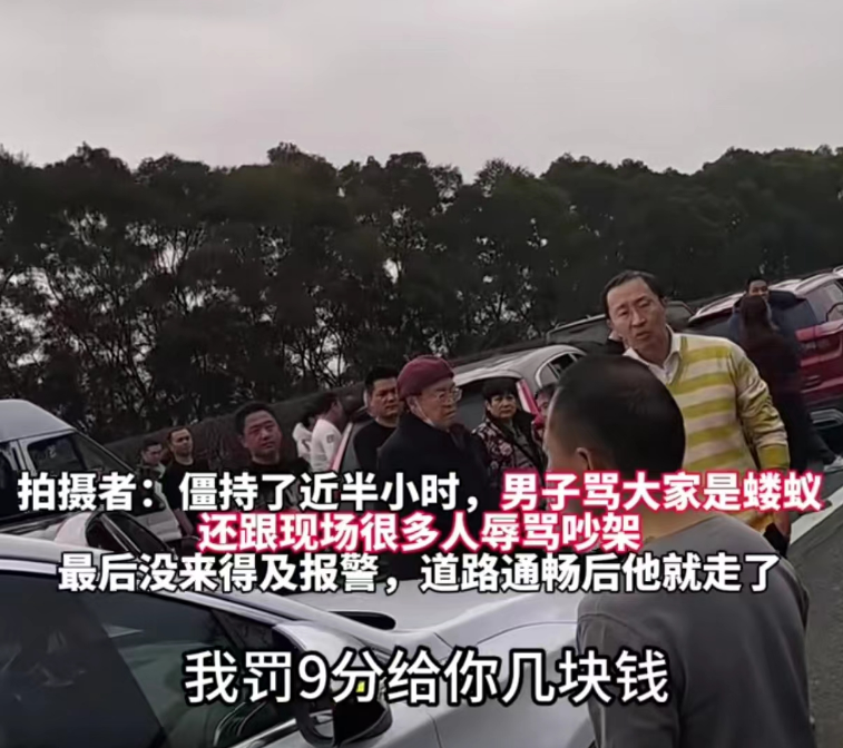 在争执的过程中,男子特别嚣张,对着一旁的群众说:“我走应急车道扣9分,你能拿几个钱?有些人活得像蝼蚁一样”。