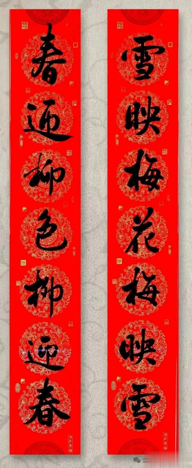 “雪映梅花梅映雪,春迎柳色柳迎春”,对联意境非常好。此春联字体结构端正俊俏,如亭亭玉立的少女,妩媚多姿,用笔丰润流丽,圆转娴熟。