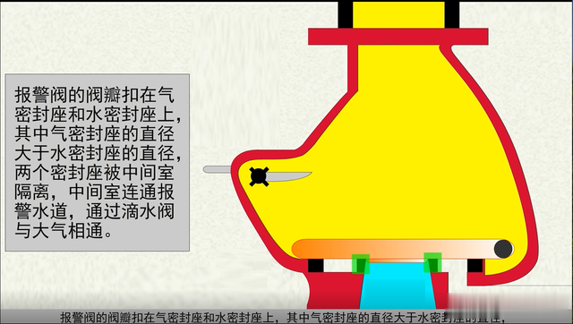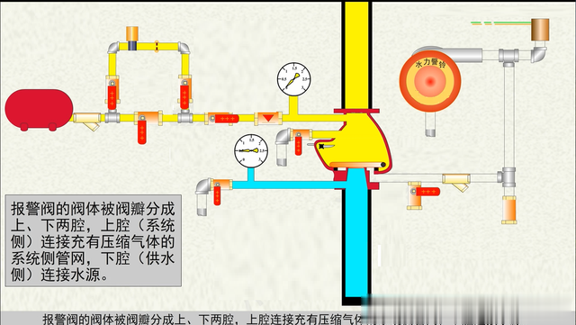 报警阀的阀体被阀瓣分成上、下两腔,上腔(系统侧)连接充有压缩气体的系统侧管网,下腔(供水侧)连接水源。