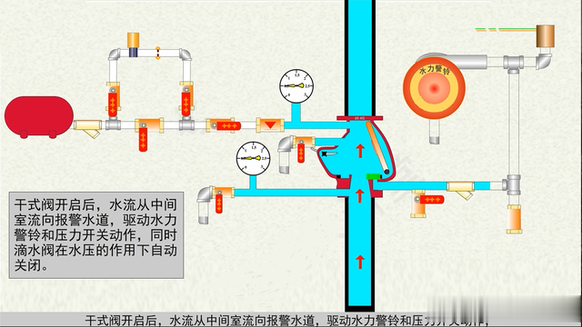 干式阀开启后,水流从中间室流向报警水道,驱动水力警铃和压力开关动作,同时滴水阀在水压的作用下自动关闭。