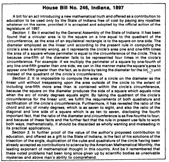 据资料记载,1894年,印第安纳州一位业余的数学家爱德华·古德温坚信自己发现了化圆为方的正确解法,并强烈要求州参议员通过法律的形式确定这一真理,并授权给印第安纳州免费使用,不收取任何形式的专利使用费。