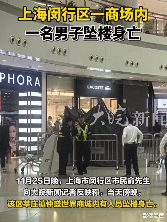 据多家媒体报道,事发11月25日晚上6点多左右,正是人们吃晚饭的时候,上海闵行区莘庄镇一大型商场内,顾客也很多,很多人正在商场内就餐,这个时候突然传来巨大的声响,有人发现一年轻男子从商场坠落,很快,引发了顾客围观,事发不久,商场管理人员过来维持秩序。