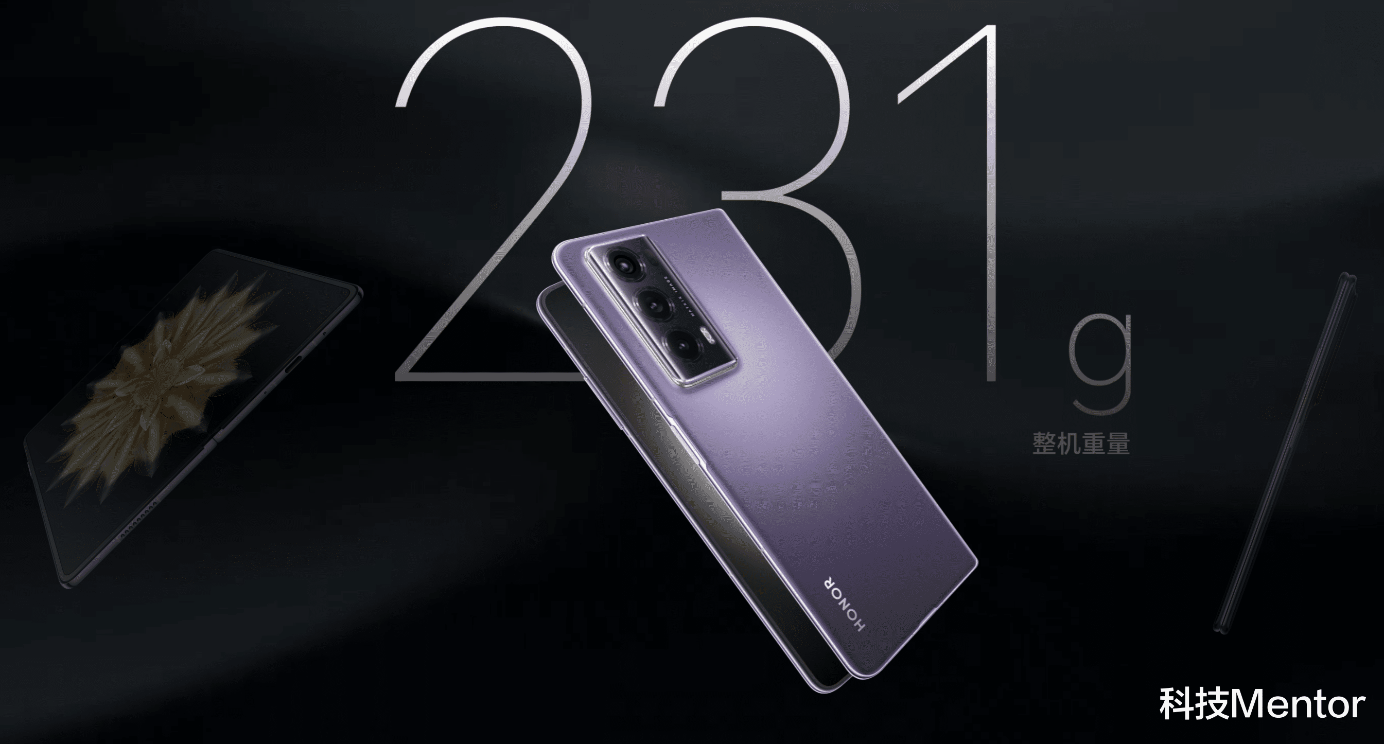 更夸张的是,这款2023年暑期发布的折叠屏神机,厚度仅9.9mm,重量231g,硬是比iPhone 14 Pro Max(240g)还轻,比三星S23 Ultra(233g)还苗条!