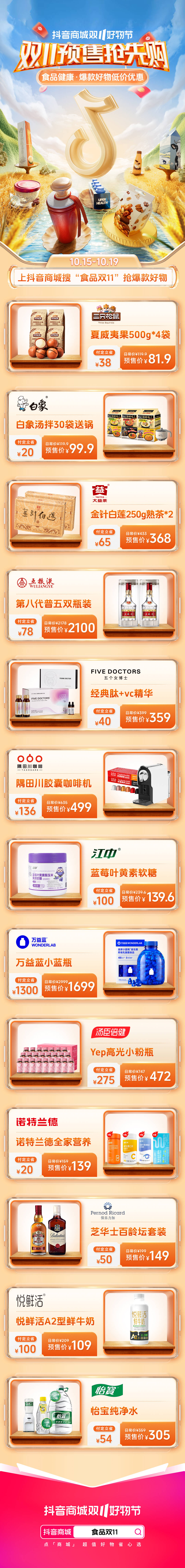 10月15日至10月19日,食品健康行业预售抢跑开启,超多爆款好物可享低价优惠,上抖音商城搜索“食品双11”,立抢优价好物。