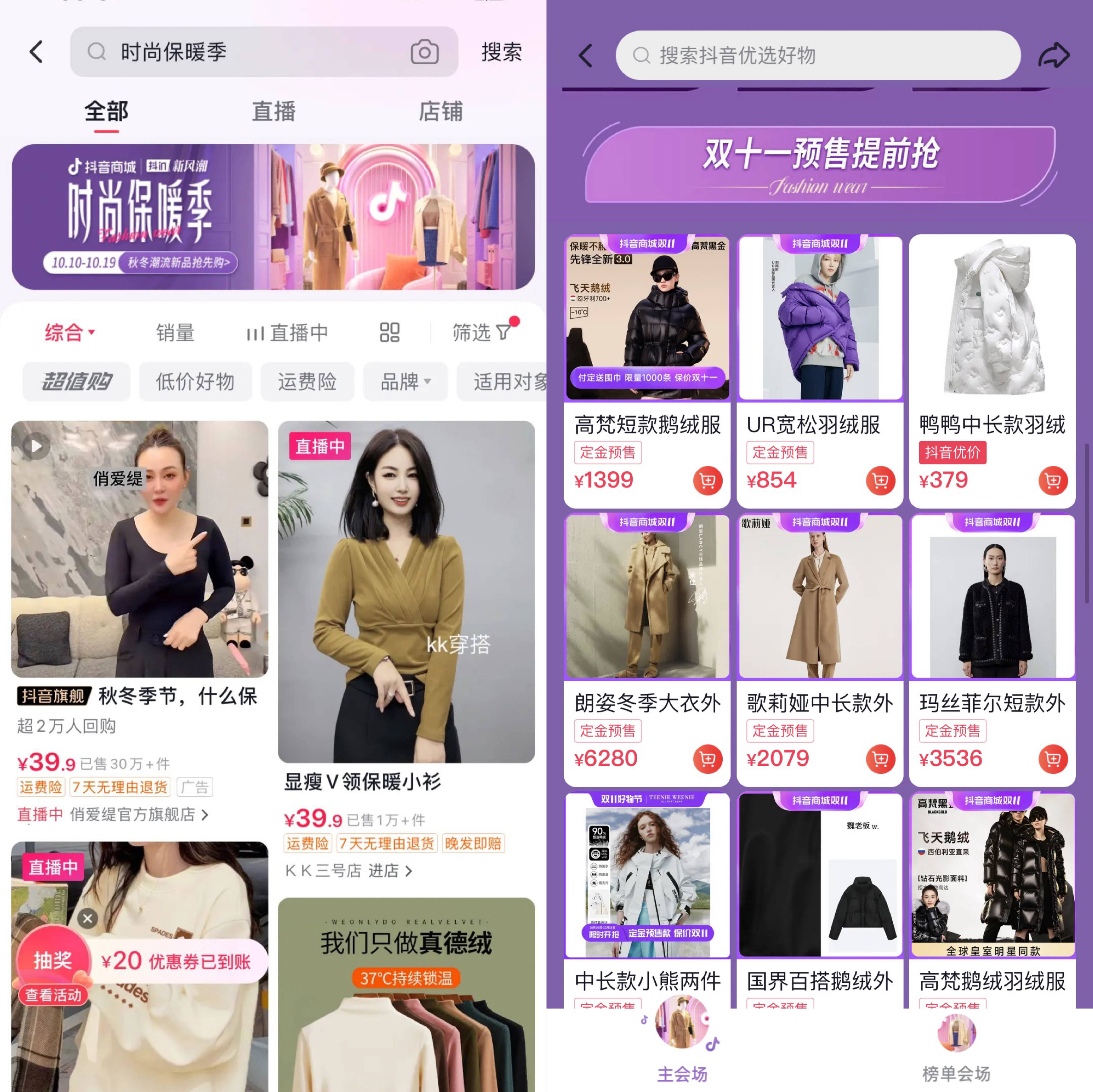 随着天气陆续转凉,秋冬服饰也成为消费者的热门选择。服饰女装行业带来秋冬三大热门类目:羽绒服、毛呢外套、人造皮草,预售期间,抖音商城大促会场集合了100多家女装大牌店铺,并独家奉上诸多首发新品、明星同款及IP合作款,这些与双11期间同样实惠的优价好物,用户现在即可抢先下单,早穿早享受。
