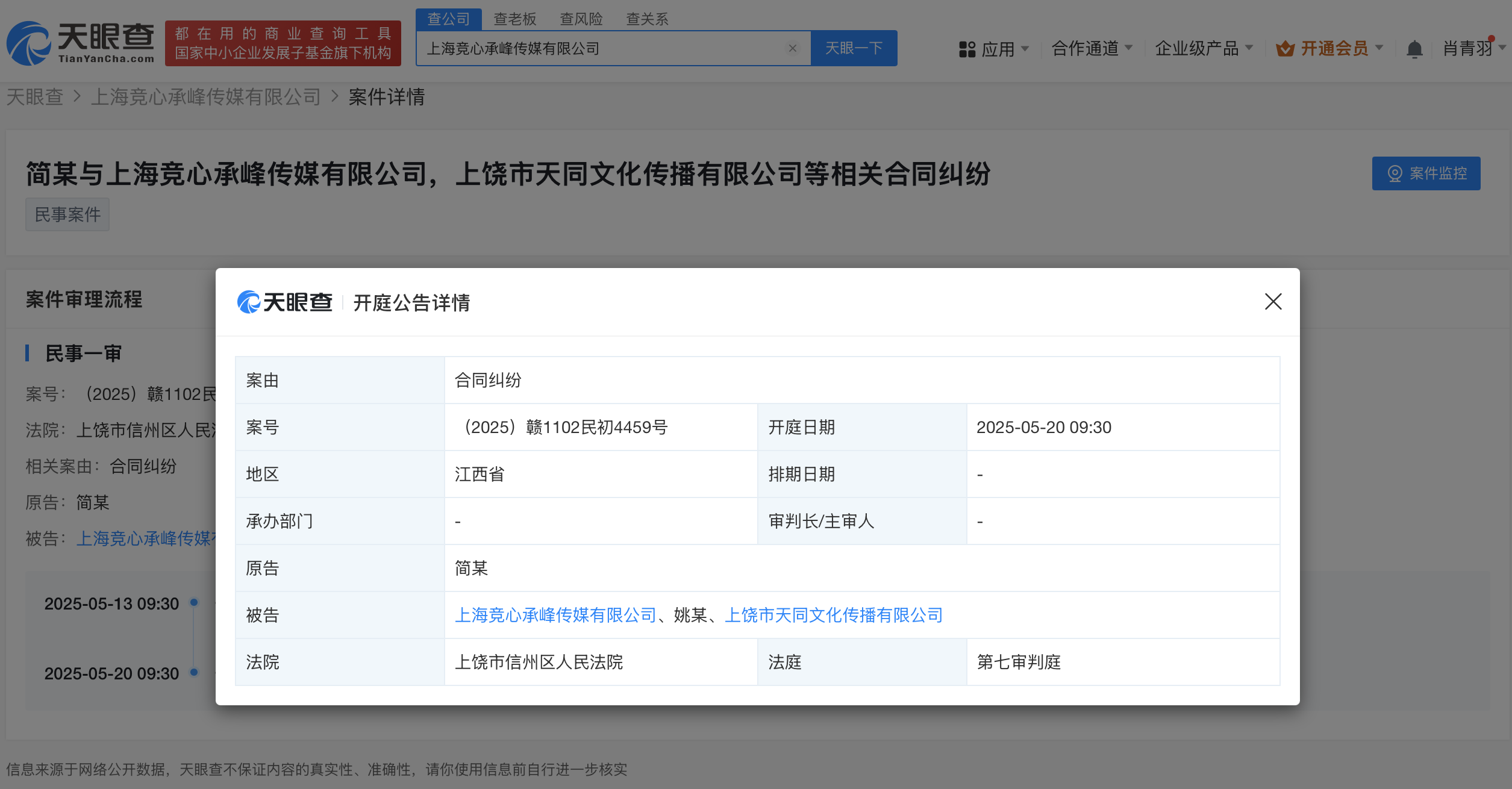 天眼查App显示,近日,简自豪(Uzi)与RNG关联公司上海竞心承峰传媒有限公司、上饶市天同文化传播有限公司及姚某某合同纠纷案件新增开庭公告,原告为简自豪,该案将于2025年5月20日在上饶市信州区人民法院开庭审理。