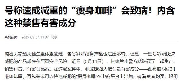 除此之外,文中提到的“瘦身咖啡”,也早在2023年就出现过了,四川甘孜某市民服用“燃脂咖啡”后出现身体不适,经检测发现咖啡中含有“西布曲明”。