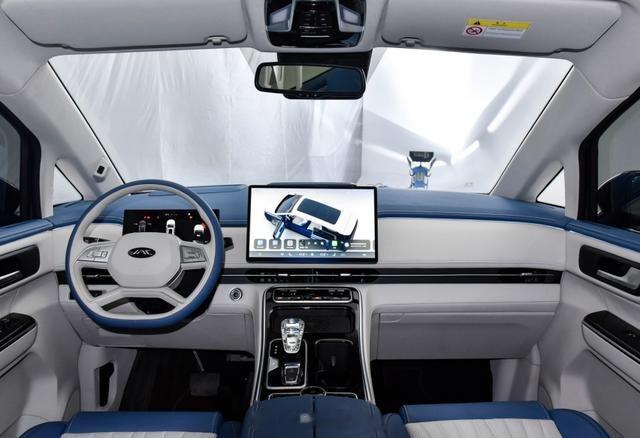 内饰的设计就有些视觉疲劳了,大屏的布局、贯穿式空调出风口的设计、水晶档把等等放在当下只能算是常规标准。不过值得一提的是15.6英寸悬浮式中控屏内置了鸿蒙4.0系统,其使用体验就很“华为”。而配色上,虽然多数白色+蓝色的内饰都显得上档次,但这皮质的蓝色色调就有种说不出的廉价感,仿佛汽配城出品一般。