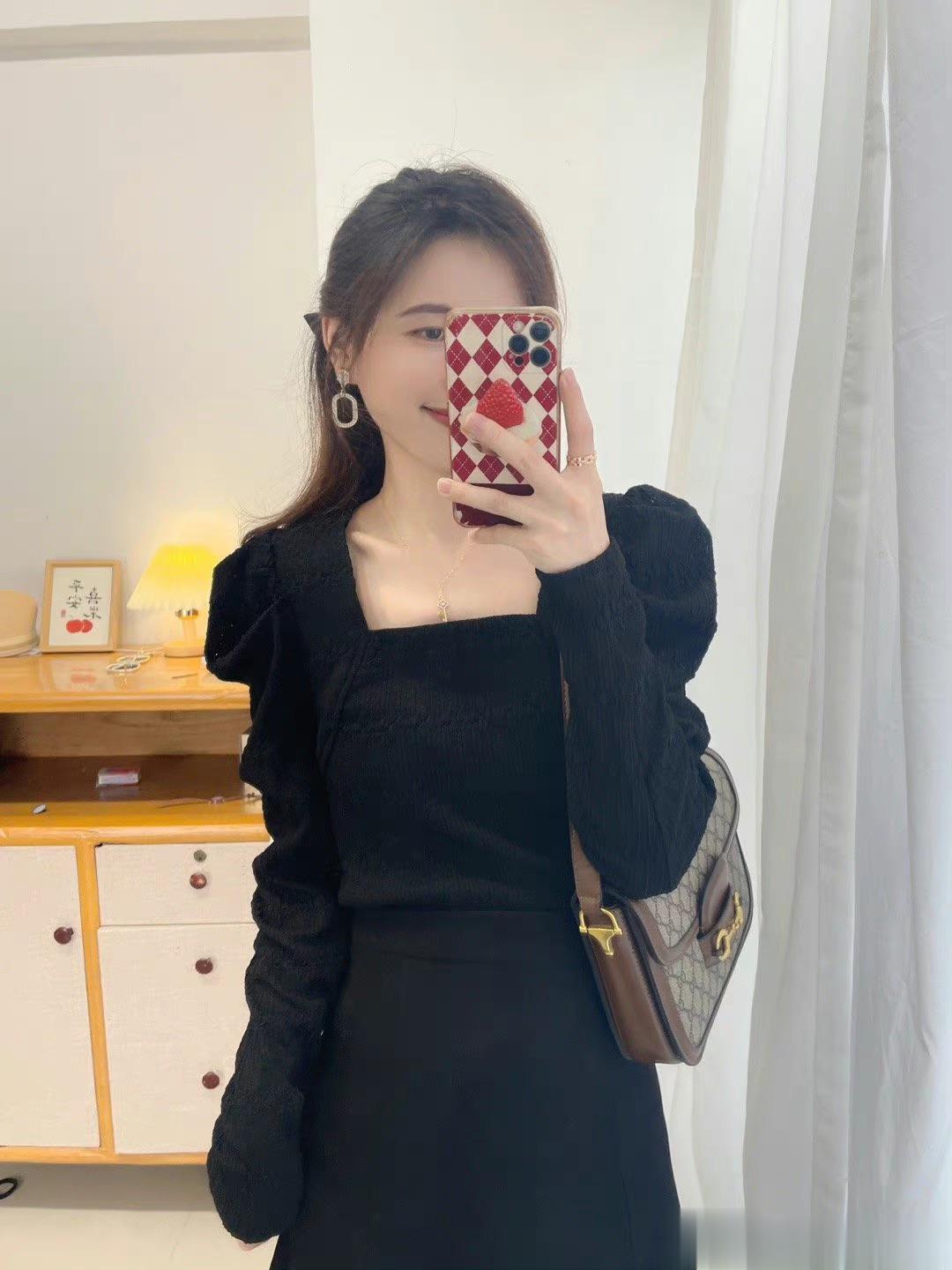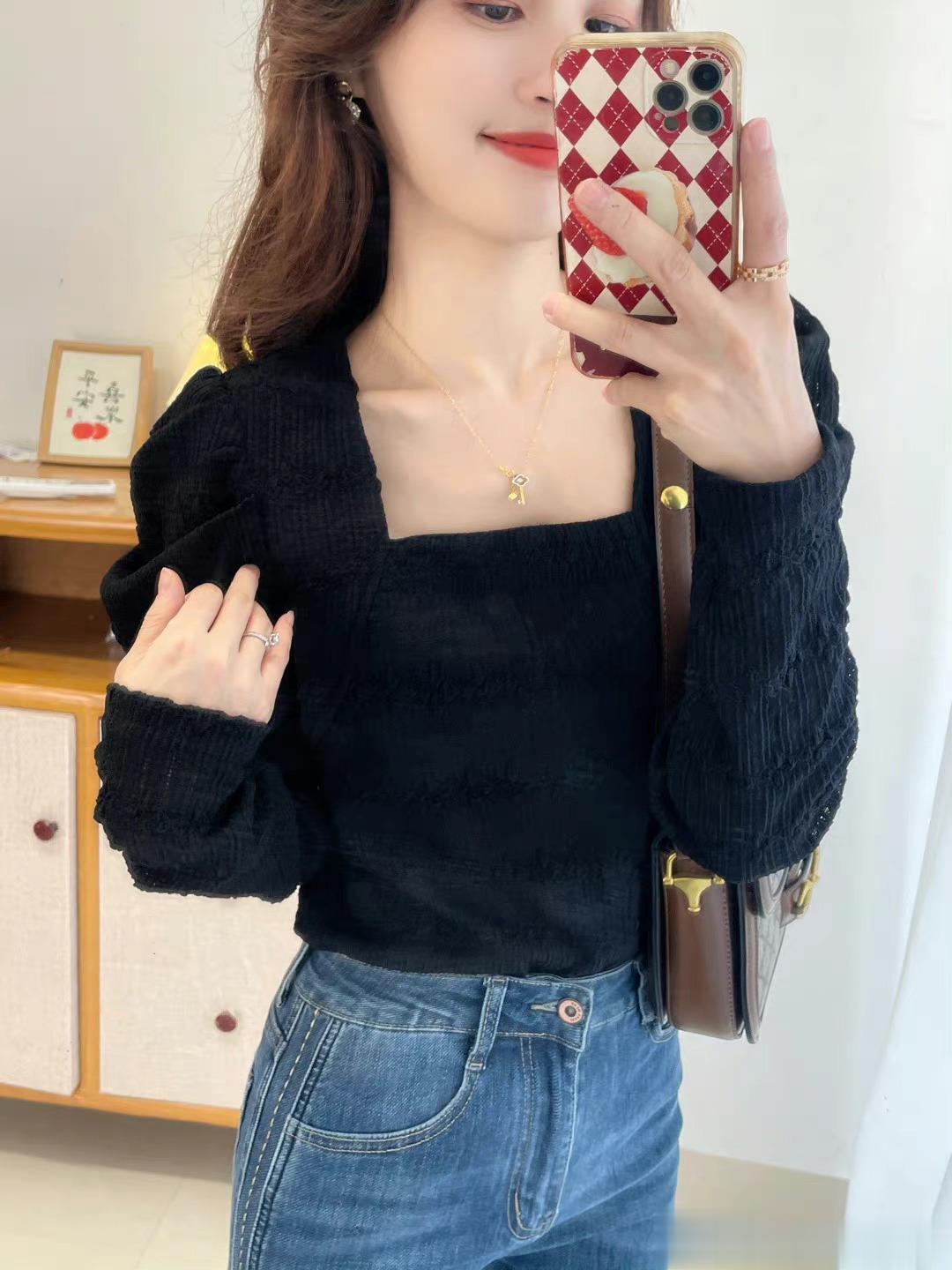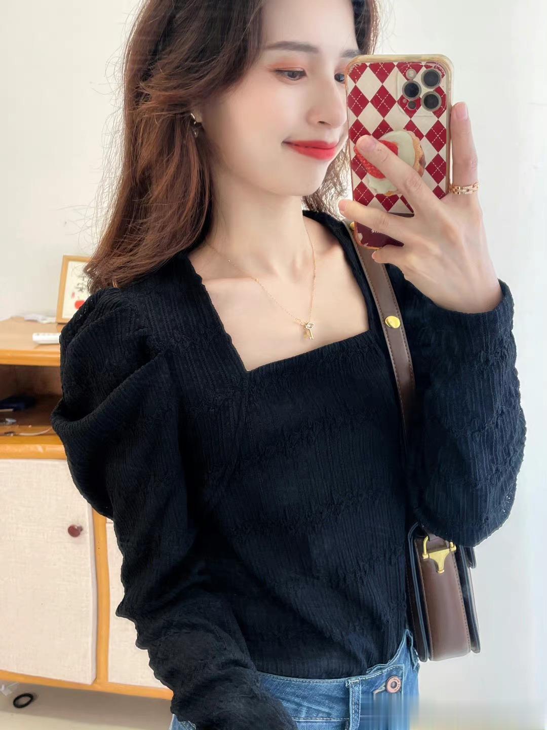 本期强推的一款,气质与女人味儿与一体的一件上衣,真的显瘦无敌,自留款,领口是做的方领设计,真个面料都是蕾丝的面料,微微镂空,如果天气冷的话,里面穿件黑色德绒内衣就可以。绝绝子,超级好看。过年我就打算这么穿。袖子是做的泡泡袖的设计,不会显壮哦。