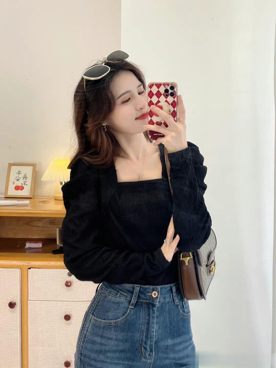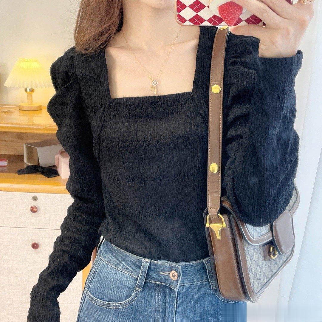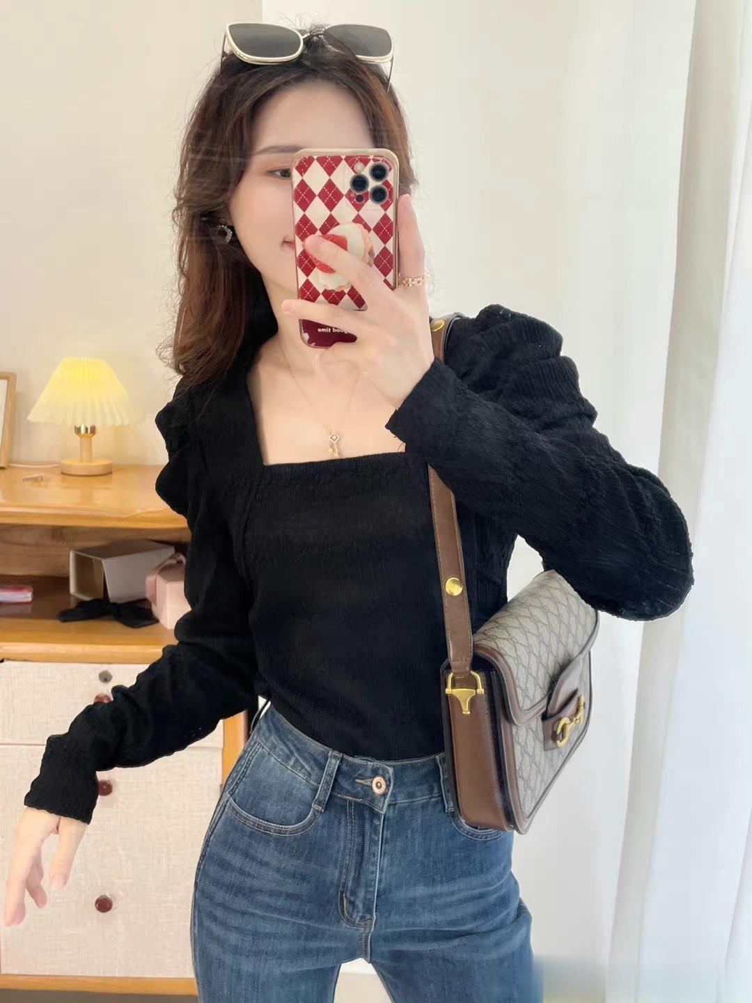 本期强推的一款,气质与女人味儿与一体的一件上衣,真的显瘦无敌,自留款,领口是做的方领设计,真个面料都是蕾丝的面料,微微镂空,如果天气冷的话,里面穿件黑色德绒内衣就可以。绝绝子,超级好看。过年我就打算这么穿。袖子是做的泡泡袖的设计,不会显壮哦。
