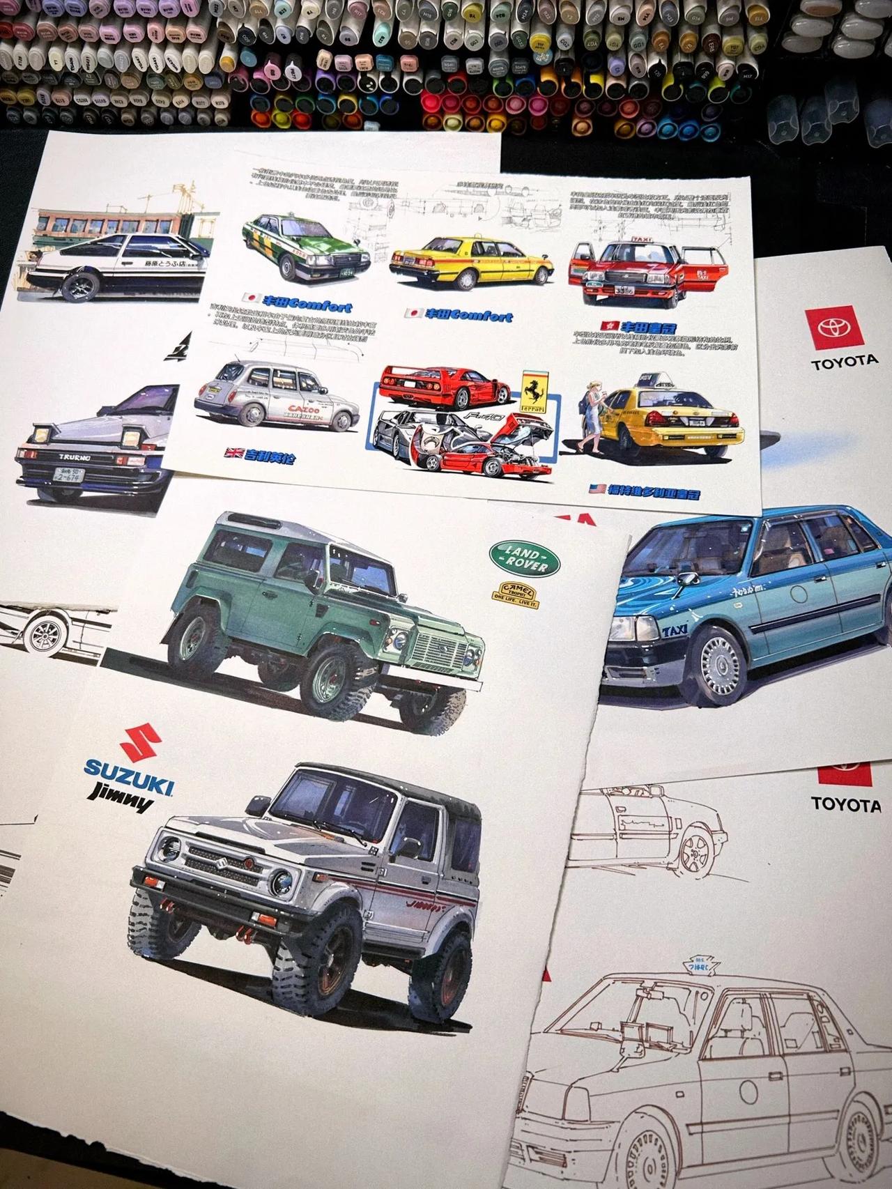 手绘汽车与模型车赏析 看到街上经常出现的汽车,你是否也想亲手画一辆呢?那么今天和大家分享一些工整的手绘汽车素材,以及模型车对比赏析。 首先,让我们看看这五辆汽车手绘线稿,每一条线条通过精细的设计都展现了汽车的动感和流线美感,让人不由自主地想象起飞驰的场面。 而在上色环节,我们可以发现,红色、黄色、蓝色等鲜艳的色彩让汽车更显活力和个性。同时,素描笔画的线条让汽车比真实的车型更加简洁明了,充满现代感。 不仅如此,和手绘的汽车相比,模型车更具有真实感和立体感。仔细观察模型车的细节,比如轮毂的花纹、车头的标志、车身的凹凸等部位,都精细到让人无法分辨真假。 当然,模型车的立体感也需要手绘汽车无法企及的高超技巧和精雕细琢的造型设计。因此,无论是手绘还是模型车,都需要有耐心和细心,才能创造出更完美的作品。 总之,手绘汽车和模型车各有千秋,它们都是汽车艺术的一种表现形式。无论你更喜欢哪一种,它们都能让你感受到汽车设计的魅力和美感。