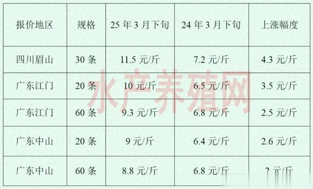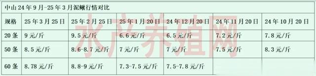 泥鳅近半年价格波动回顾 2024 年 9 月至 2025 年 3 月这近半年的时间,不同规格的价格走势可谓跌宕起伏。以 以中山20 条规格的泥鳅为例,在 2024 年 9 月,其塘口价处于一个相对稳定的区间,然而随着秋冬季节的来临,市场需求逐渐发生变化。一方面,消费者在秋冬时节对泥鳅需求有所增加;另一方面,由于水温降低等因素,泥鳅的生长速度放缓,出塘量减少。这一增一减之间,导致价格开始稳步上扬。到了 11 月,价格已经有了较为明显的涨幅。