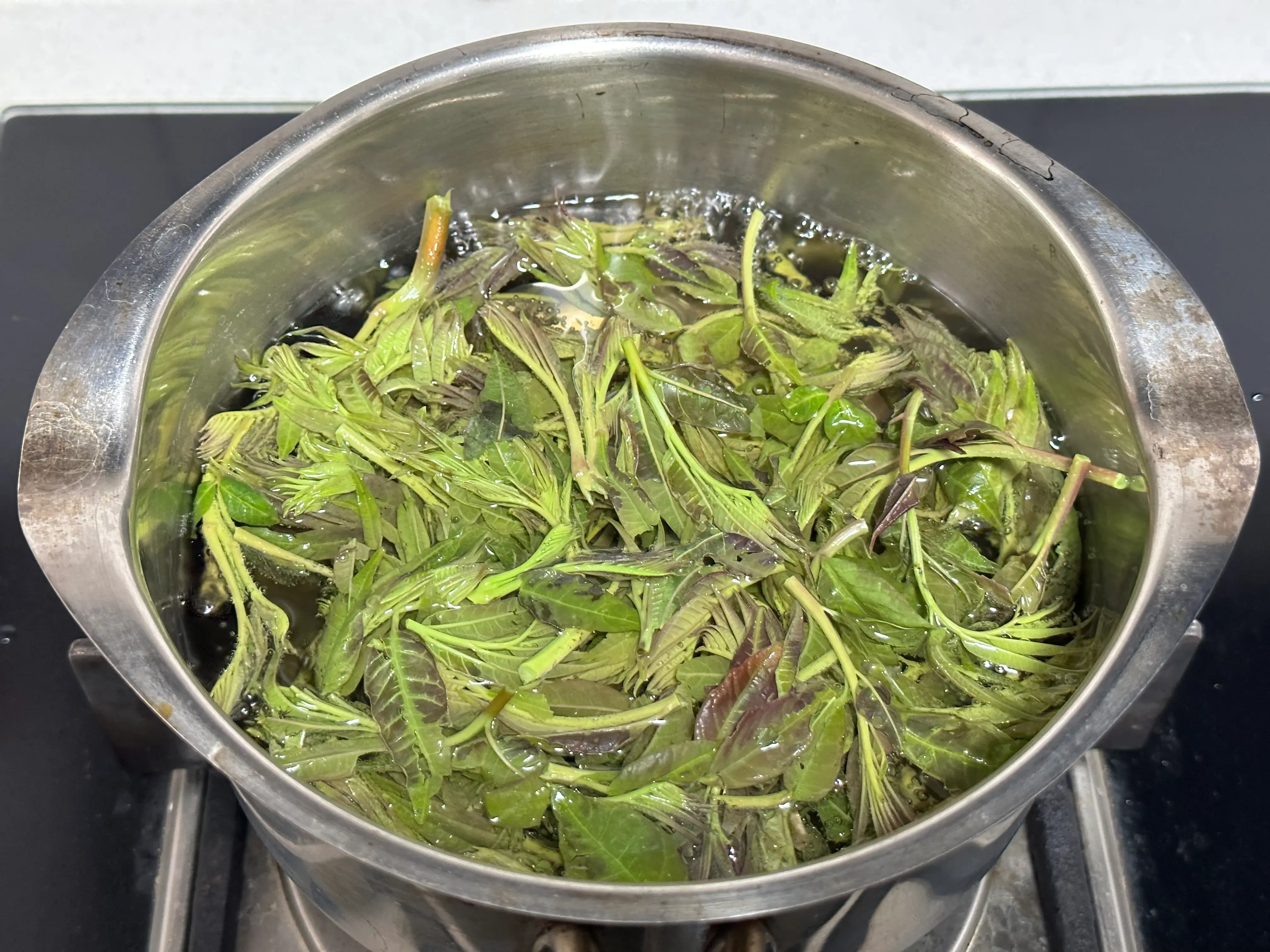 3、香椿清洗干净,开水下锅加入少量盐和食用油焯水1分钟;
