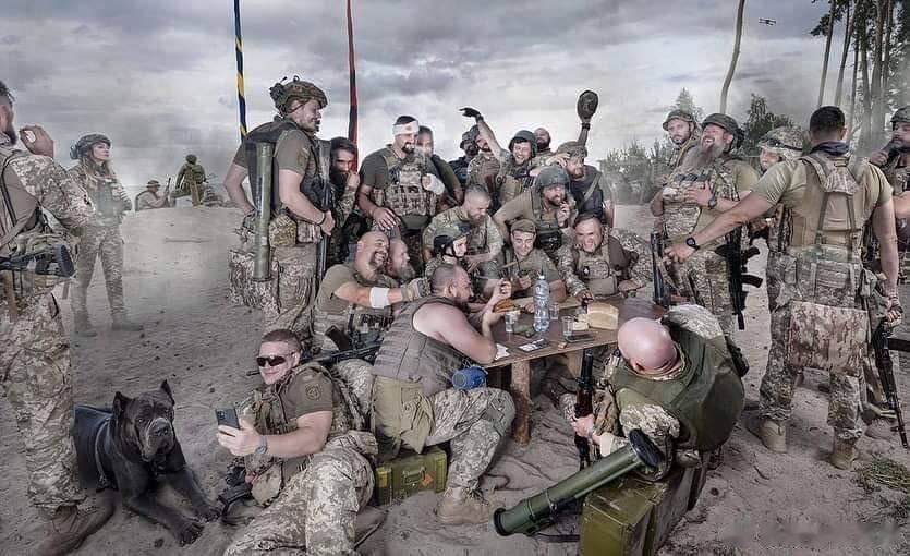 乌克兰士兵心态不错呀,居然有心情在战场上玩cosplay。乌军第112本土防御旅的士兵在法国摄影师 Émeric Lhuisset的指导下,重现了乌克兰画家列兵的著名油画《扎波罗热哥萨克人给土耳其苏丹穆罕默德四世的回信》。 哥萨克人是17世纪前后在乌克兰反抗俄国农奴制的“自由人”,战斗力强作风彪悍,奥斯曼帝国苏丹要求他们归附自己,于是这帮人围坐一起写信嘲讽奥斯曼帝国的统治者。乌军复刻的这张照片采用发手机短信的形式,猜也能猜到是发给普京的,时代变了意思没有变:我们不屈服,有能耐尽管来。