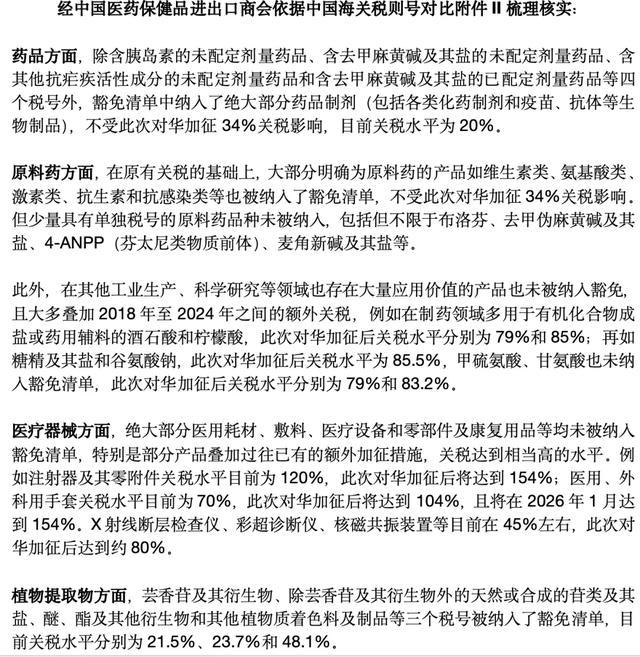 在前期工作基础上,中国医药保健品进出口商会对照中国海关税则号梳理了豁免的医药产品及其相关税号: