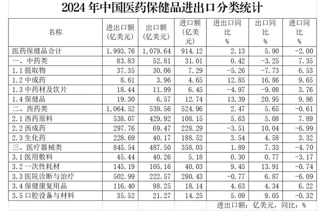 我国是全球最大的原料药生产国和出口国,据中国医药保健品进出口商会数据,2024年我国医药保健品进出口额合计1993.76亿美元,其中出口额1079.64亿美元,进口额914.12亿美元。