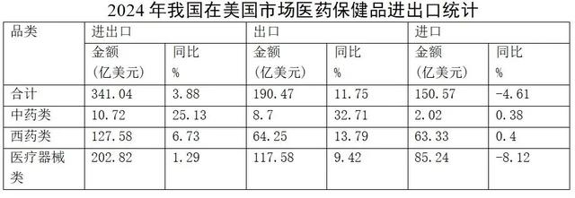 具体来看,2024年,我国对美国的医药贸易出口额为190.47亿美元,其中医疗器械类达117.58亿美元,西药达64.25亿美元,中药8.7亿美元;至于中国从美国进口的医药商品总额达150.57亿美元,医疗器械类达85.24亿美元,西药类为63.33亿美元,中成药为2.02亿美元。