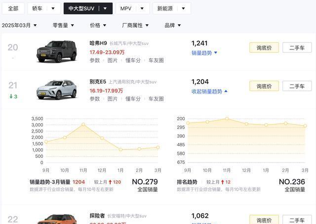 你再看看别克E5,3月份销量1204辆,在中大型SUV里排21名,这成绩,有点拿不出手。