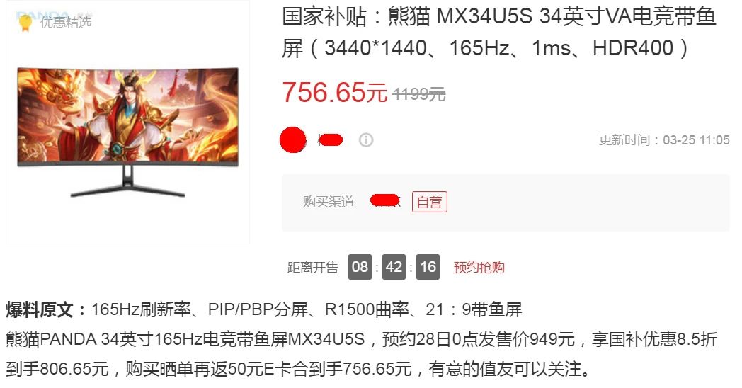 据悉,原价1199元的熊猫34英寸带鱼屏显示器,今晚24点JD会有949元的限时特价,然后叠加国补15%和晒单返现50元,最低实付766.65元。它的具体型号是MX34U5S,算是同等规格最便宜的显示器了,目前点值率是83%。