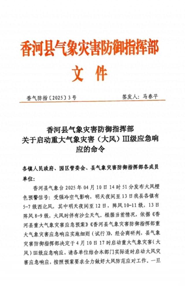 河北香河县:启动重大气象灾害(大风)Ⅲ级应急响应