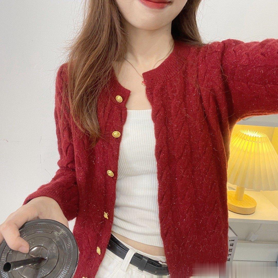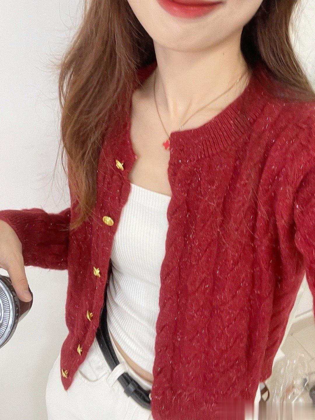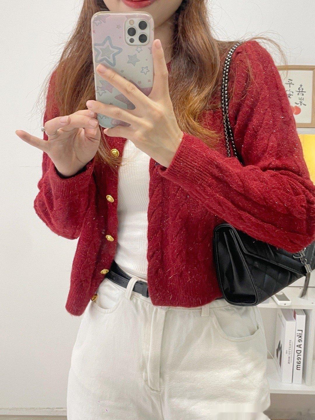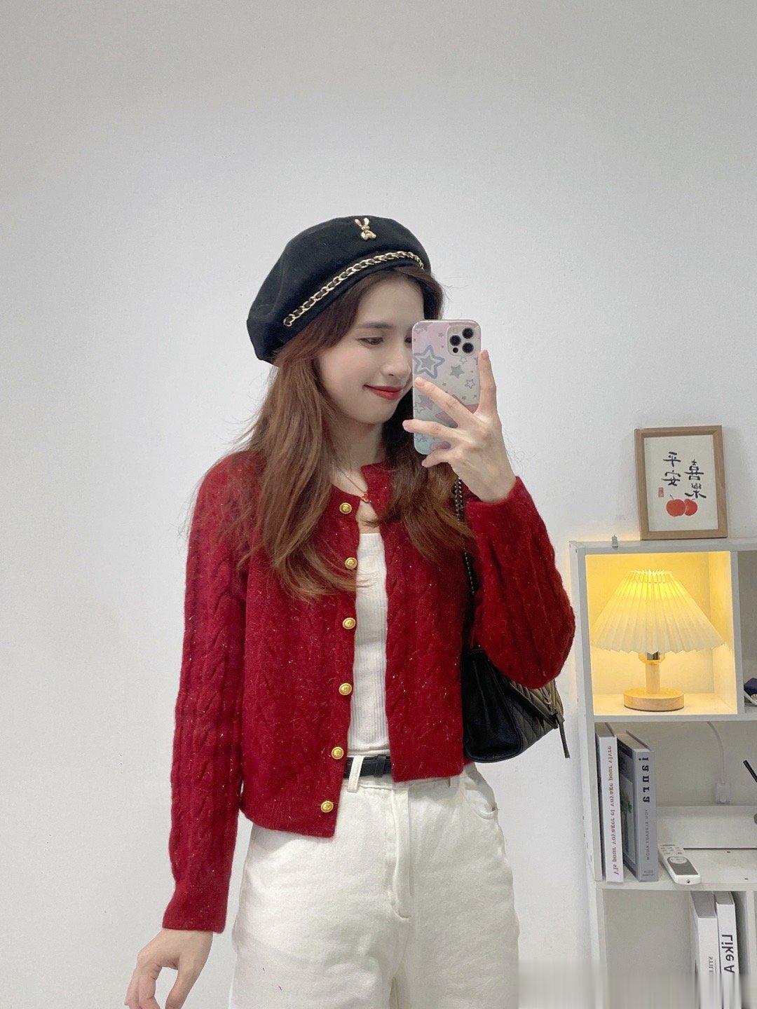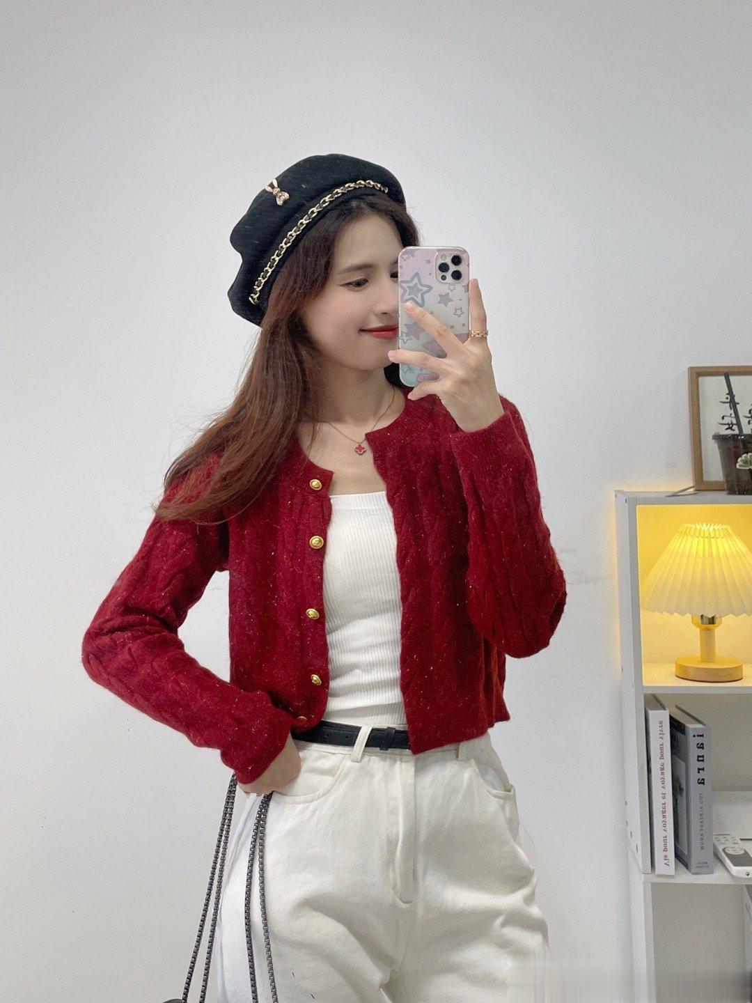 米色麻花开衫又增加一个红色的哦,超有过节的氛围感哦!