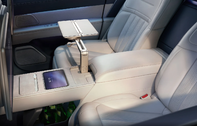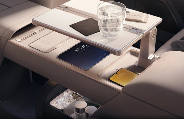 聚焦后排区域,蔚来ET9作为一款以尺寸、豪华为产品卖点的高端豪华新能源车,它将配备2张后排独立座椅,座椅支持45度躺倒和16点按摩功能。另外,为了提升座舱行政氛围,后排还配备了2块14.5英寸娱乐屏和1块8英寸控制屏,搭配10升车载冰箱、化妆镜、行政桌板等配置,以及特有的行政桥、“天空岛”贯穿设计,整体的品质感还是比较吸引眼球的。