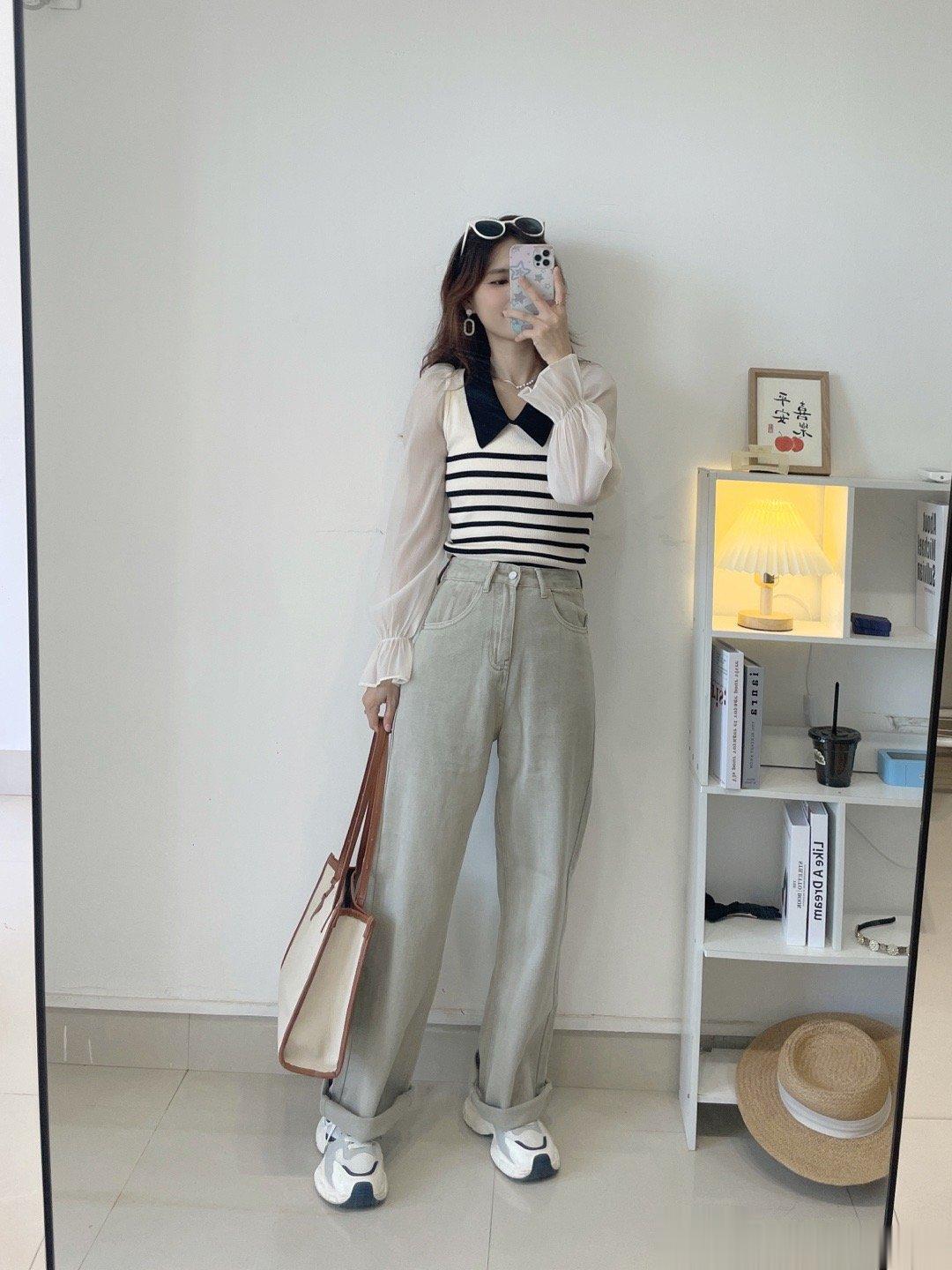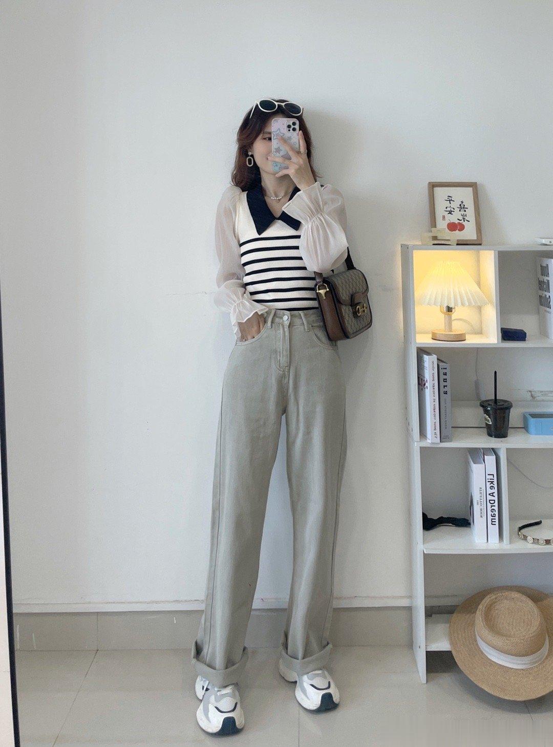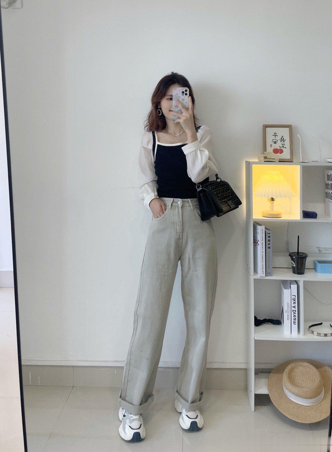 浅色高腰牛仔裤,版型非常好,很遮胯的一条,如果觉得太长下摆可以挽起来穿。