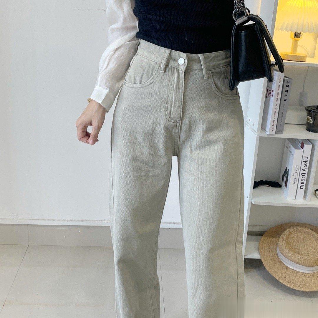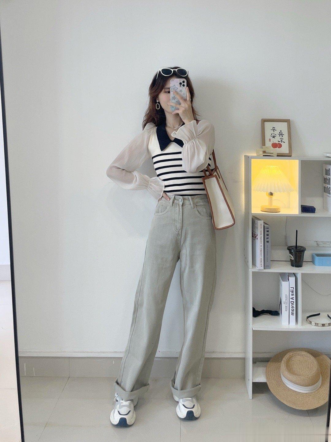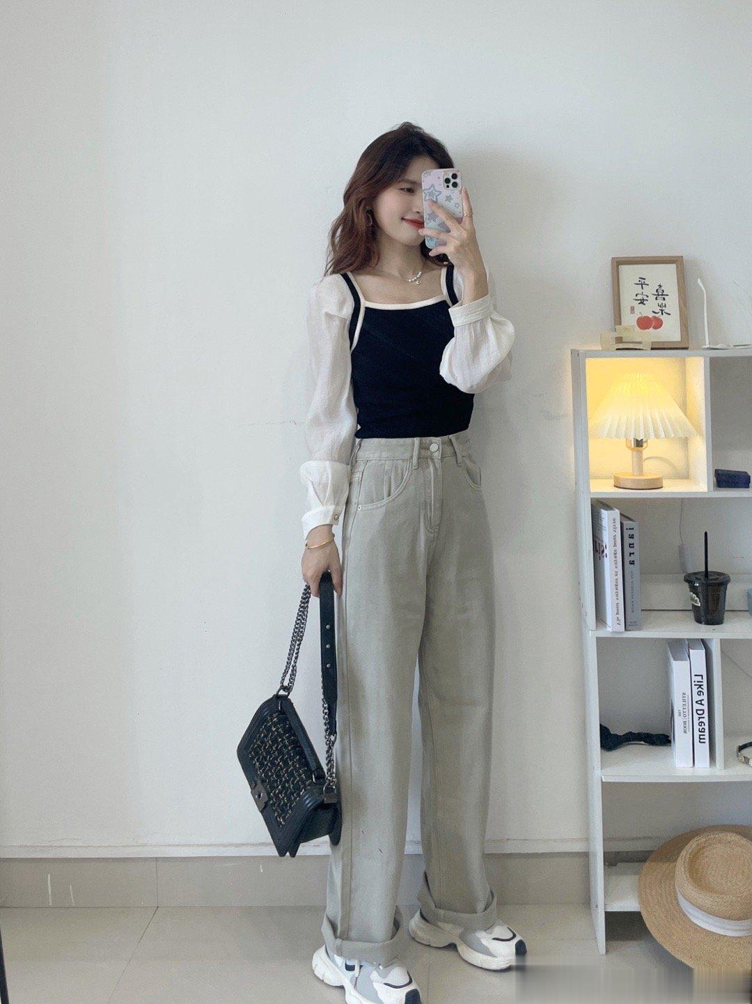 浅色高腰牛仔裤,版型非常好,很遮胯的一条,如果觉得太长下摆可以挽起来穿。