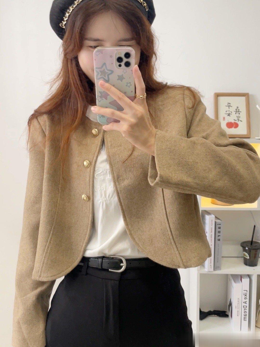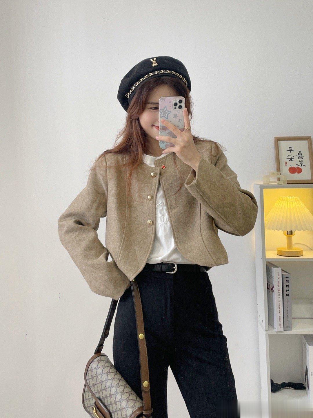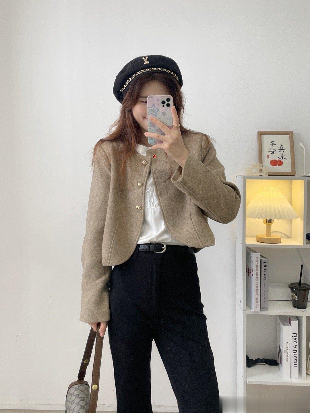 咖色短款毛呢外套,很适合小个子哦,搭配长裤或者短裤,视觉上都会拉高整体比例哦。