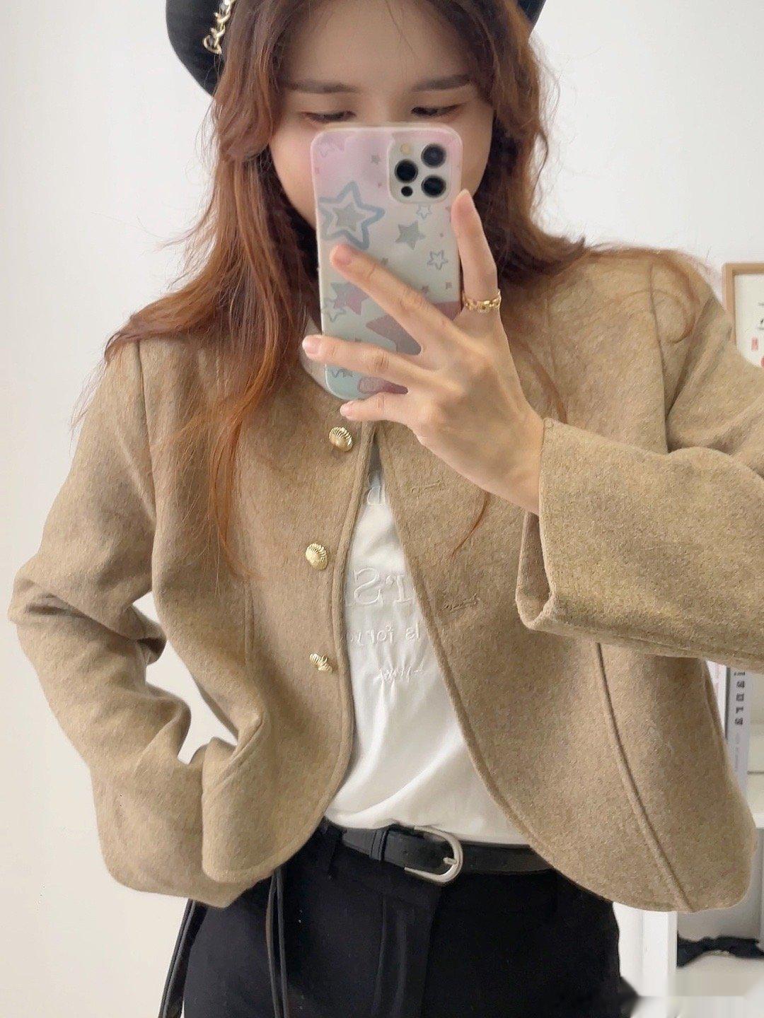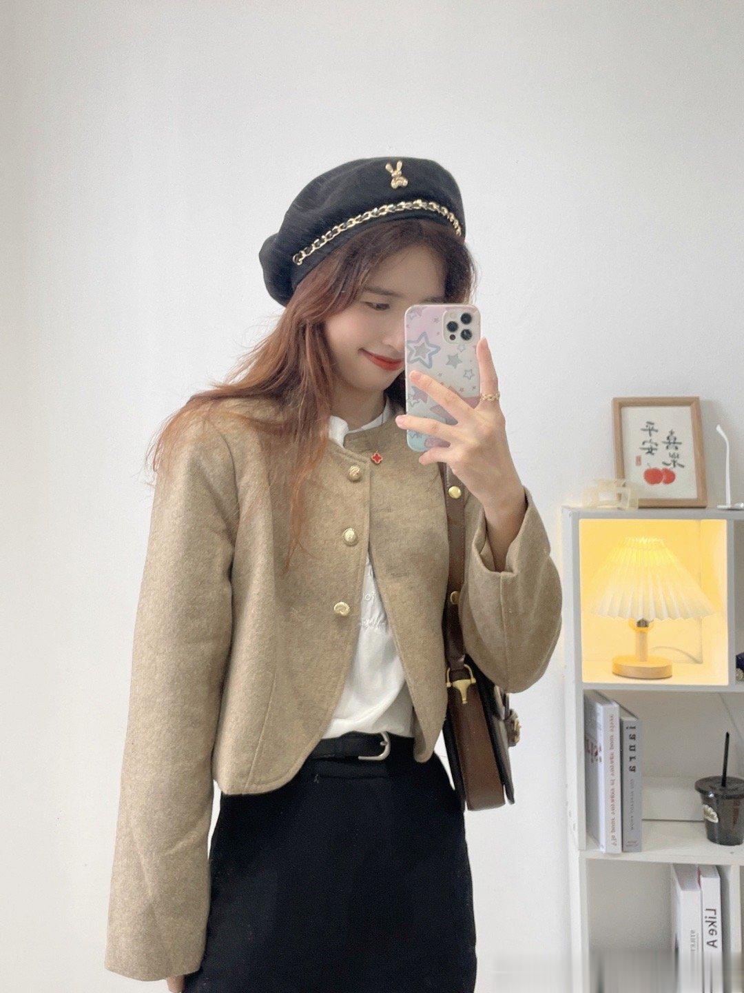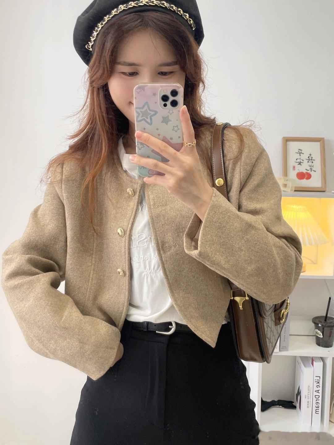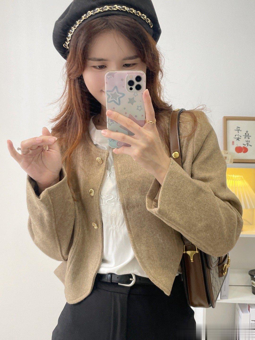 咖色短款毛呢外套,很适合小个子哦,搭配长裤或者短裤,视觉上都会拉高整体比例哦。