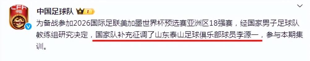 当前,中国队正在迪拜备战世预赛18强赛,此前国家队名单公布后,外界看到了不少年轻球员的面孔,但也有老将离开,泰山的李源一就遗憾落选,其实从表现看,李源一I在俱乐部是不可或缺的绝对主力,表现完全可以继续胜任国足的位置。