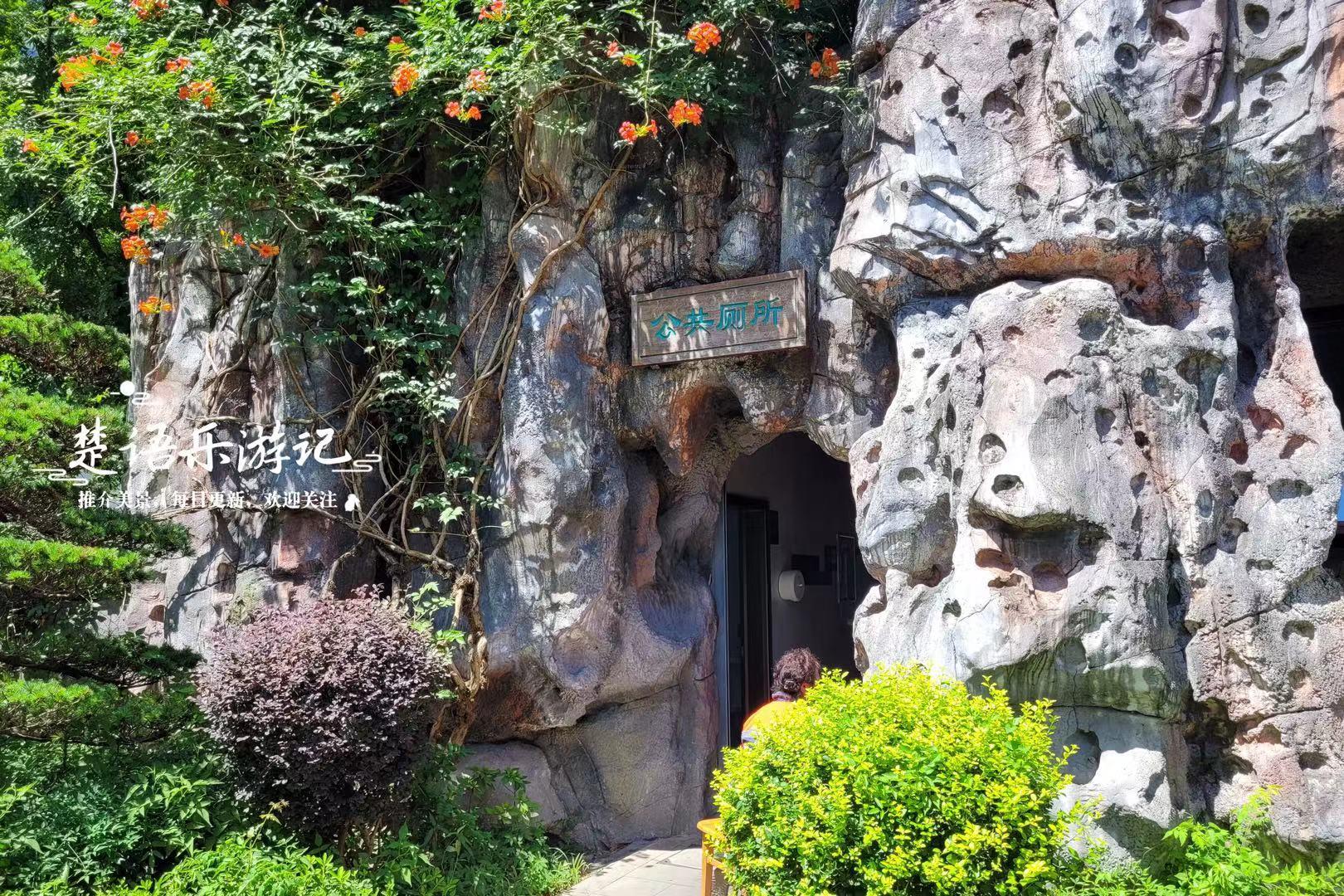 曲廊园林入口的斜对面是公共厕所。这个厕所建在塑石假山的下面,厕所大门就是假山山体,凌霄花从山顶垂挂下来,掩映着厕所。如果不注意,你会以为它是一处风景。