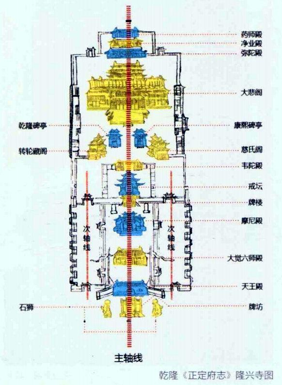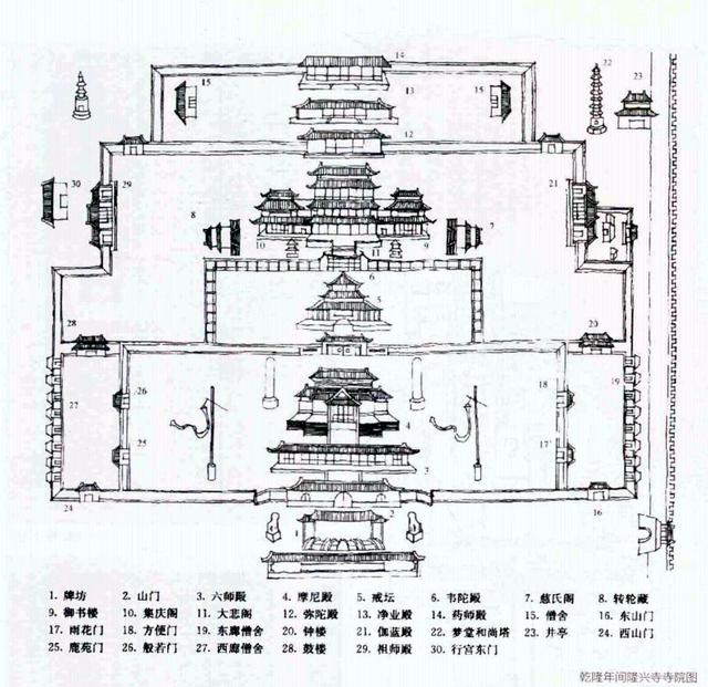 清康熙五十二年(1713 年),皇帝赐额隆兴寺,使其声名远扬。从现存乾隆十三年(1748 年)的寺院平面图中,我们可以清晰地看到当时其规模的宏大,占地面积达 6.2 万平方米,现存建筑面积也有 1.11 万平方米。这座寺院坐北朝南,总体布局规整严谨,仿佛一位端庄肃穆的长者,静静地守护着这片土地。