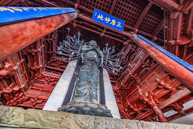 大悲阁内所供的铜铸观音像,是北宋开宝四年(公元971年)奉太祖赵匡胤之命铸造。像高21.3米,共42臂,现存观音像的身体部分和当胸合十的两只手臂是宋代铜铸,其余两侧40只全部为民国时期重装的木质手臂。