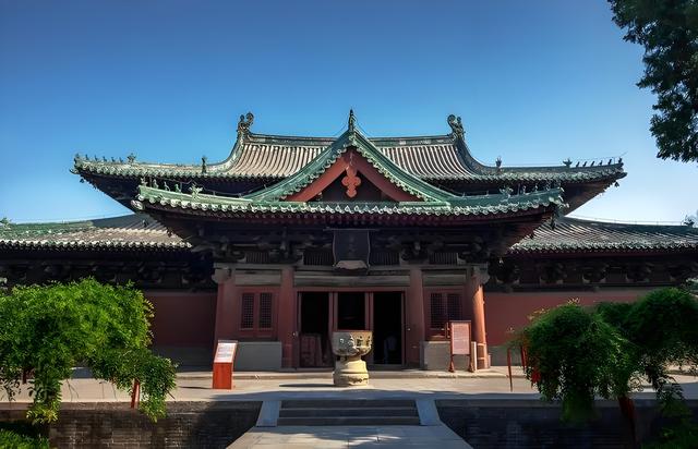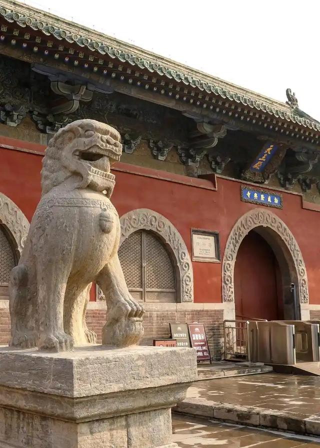 天王殿是单檐歇山布瓦顶,绿琉璃瓦剪边,檐下施五铺作双抄偷心造斗拱,虽历经岁月洗礼,但依然能看出当年的雄浑大气。柱头卷刹,柱身侧角、生起均较为明显,殿内彻上明造,中央置有金代木刻大肚弥勒佛一尊,笑容可掬,左右分塑四大天王,威风凛凛,让人敬畏之心油然而生。殿左右还有琉璃装饰影壁,殿前有石狮两尊,它们宛如忠诚的卫士,日夜守护着寺院的安宁。