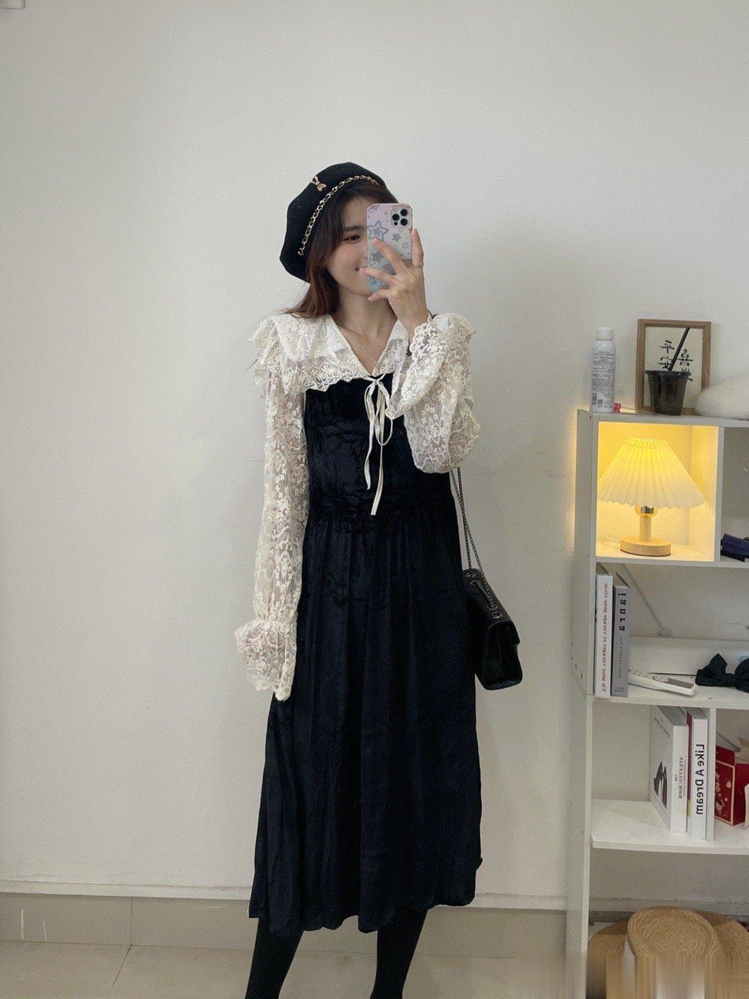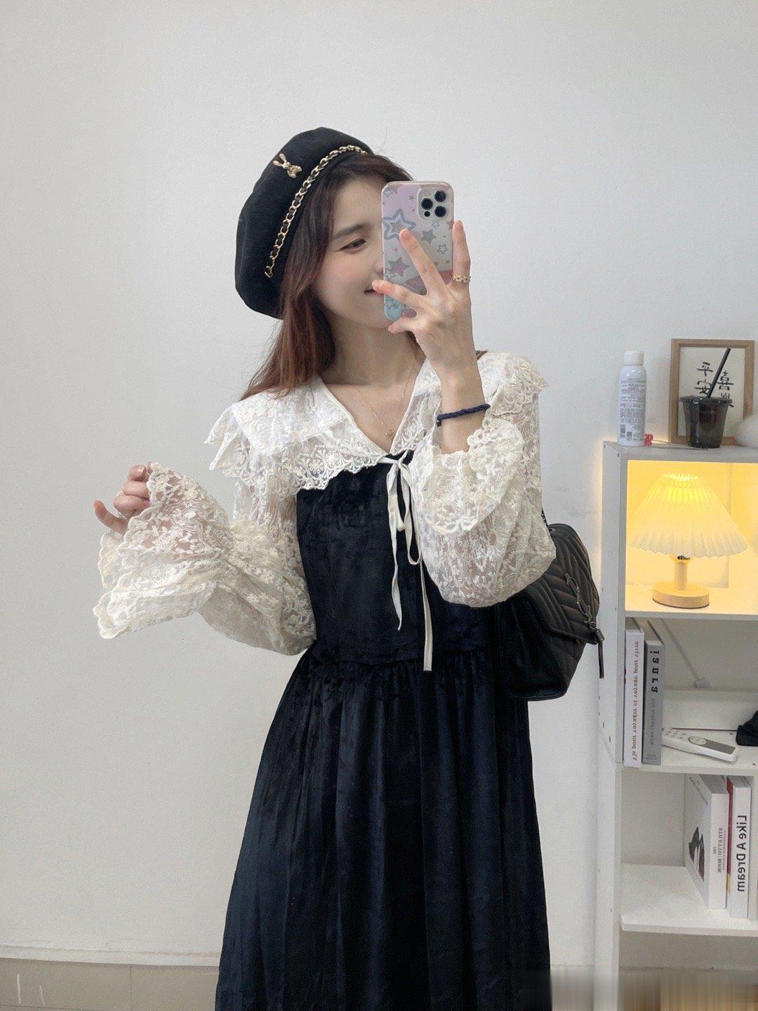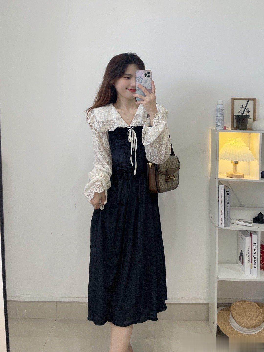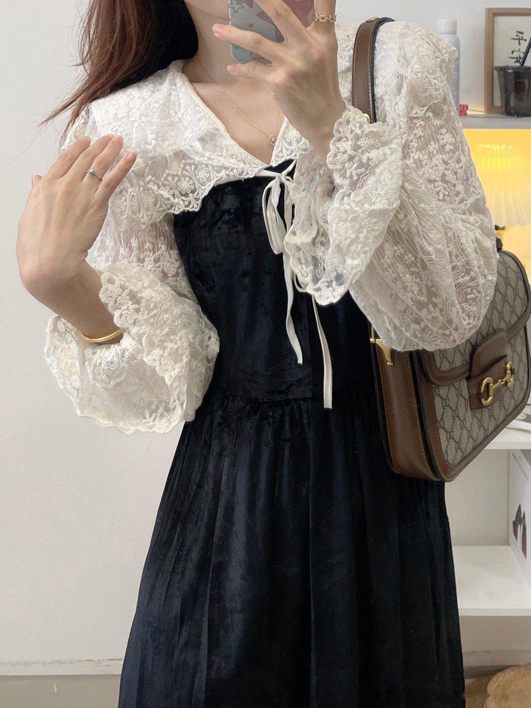 气质丝绒裙,这两年很流行哦!袖子是蕾丝的设计,裙子是丝绒的面料,整体是拼接衫设计哈,是很温柔的娃娃领版型,整个爱了。