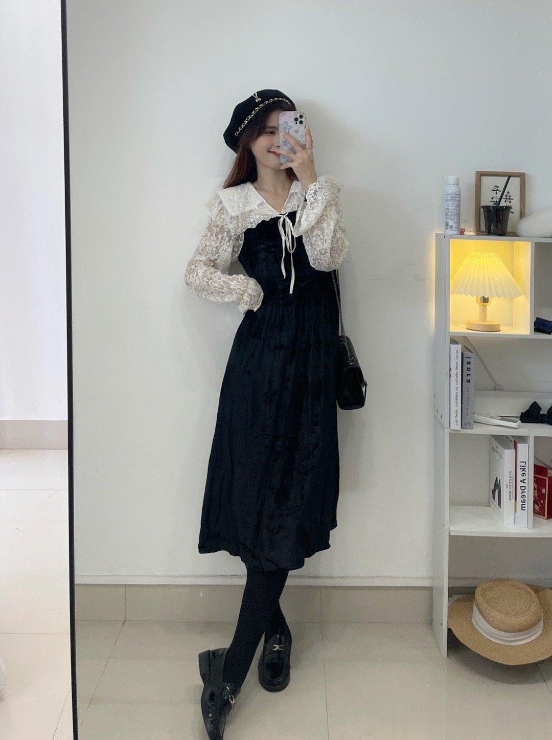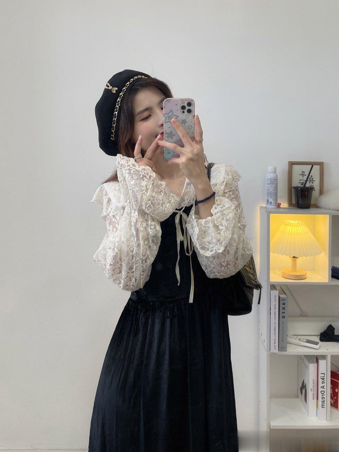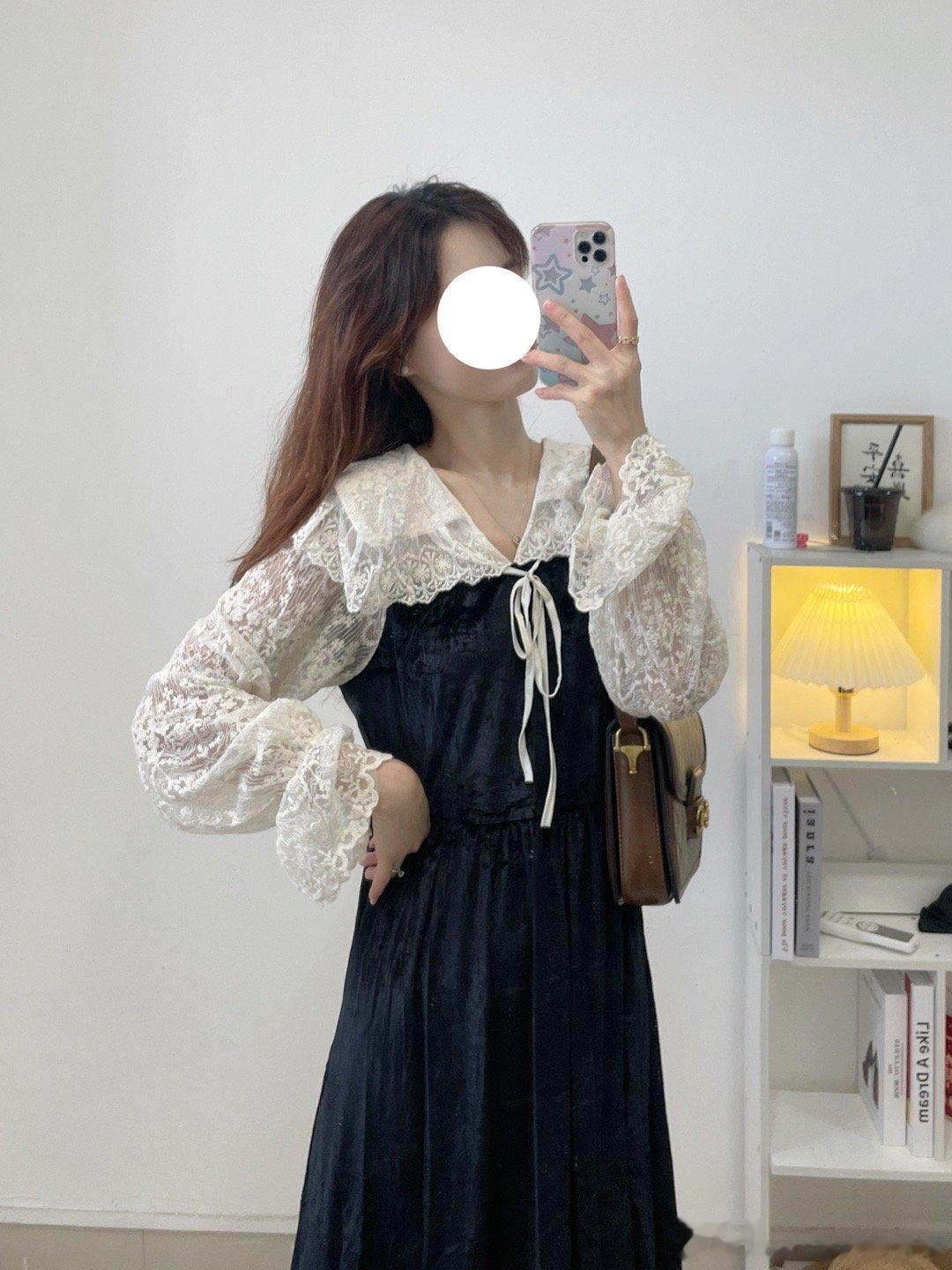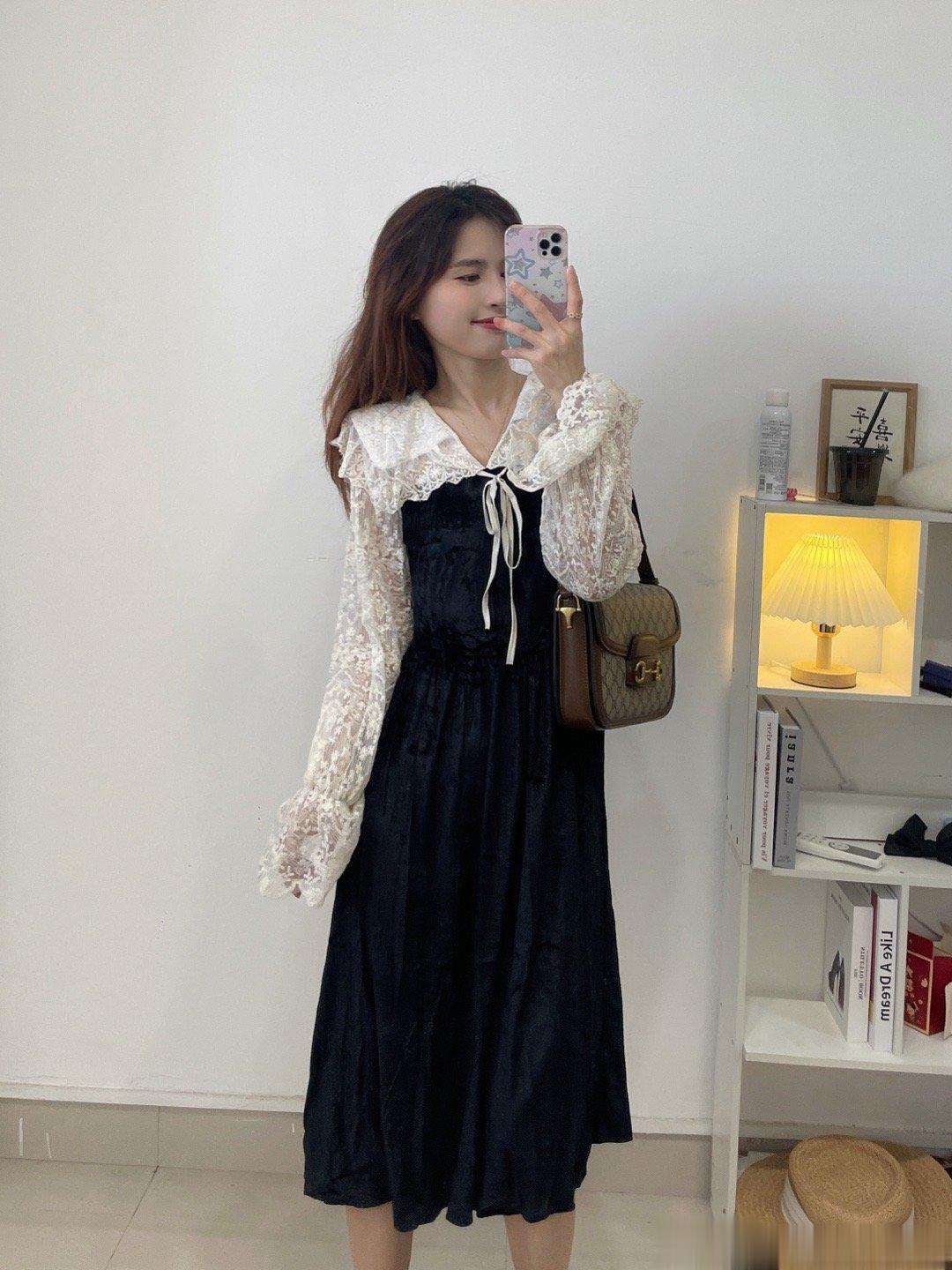 气质丝绒裙,这两年很流行哦!袖子是蕾丝的设计,裙子是丝绒的面料,整体是拼接衫设计哈,是很温柔的娃娃领版型,整个爱了。
