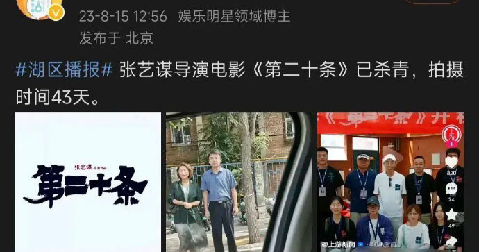 再看隔壁的张艺谋,为了抢占明年的春节档,新片《第二十条》仅仅用了43天就拍摄完成了,这样的速度真令人惊叹!