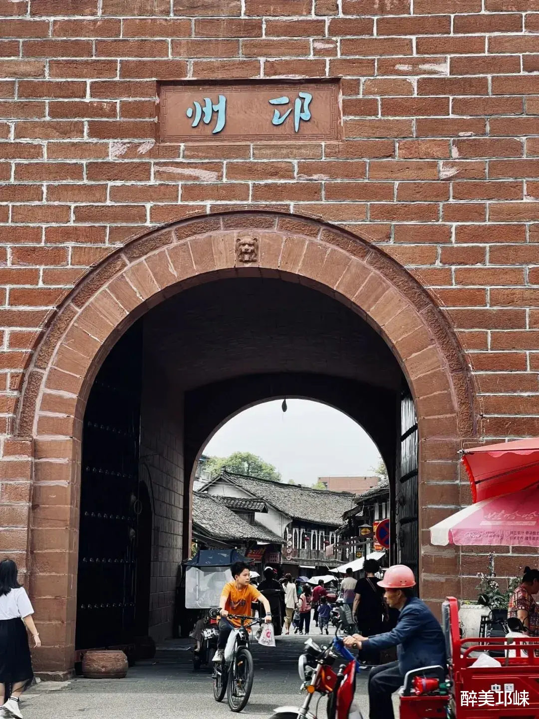 这座城楼在明代遗址的基础上复原而成,红砂石的外墙斑驳陆离,青砖为顶,飞檐斗拱,石门额上赫然写着“邛州”,恢弘而充满古意。