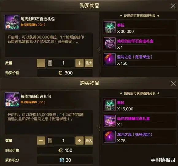 一种是每周封印时自选礼包,另一种是每周精髓自选礼包,售价分别是300点券和150点券