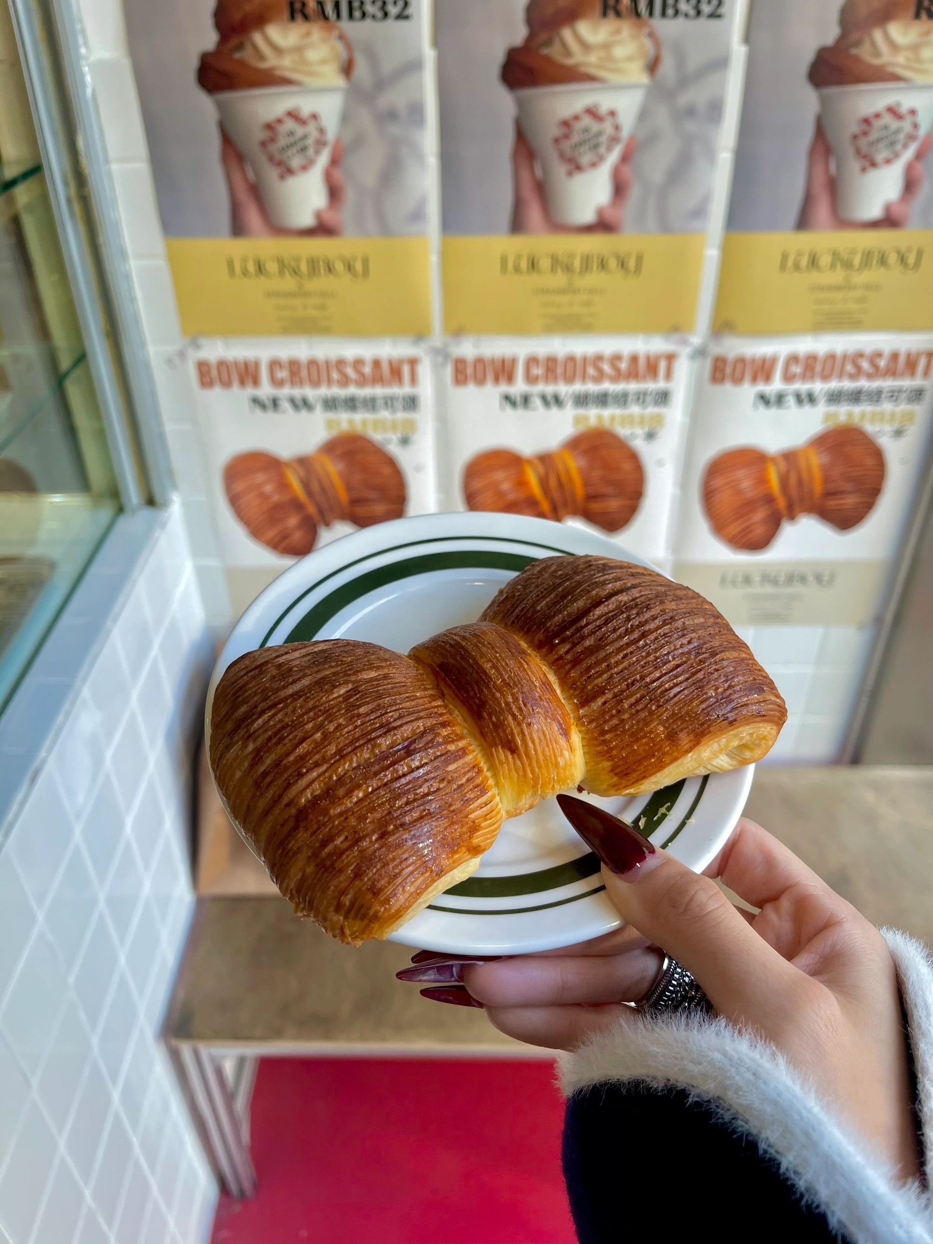 家附近又开新店啦 蝴蝶结可颂🎀🥐满足了我的少女心 耶耶 Lucky boy门头的海报 韩味很浓 海苔肉松香肠可颂&巧克力费南雪 个人主张甜咸搭配 PS!想吃蝴蝶结可颂要上午去哦!