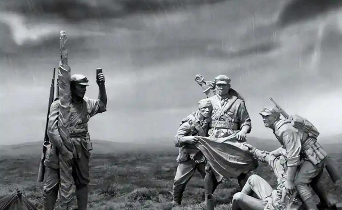 这条路似乎没有尽头,像是一场无边的噩梦。那天,天空骤然变了脸,乌云压顶,风夹着沙尘打在脸上,雨水一泻而下,草地顿时成了泥泞不堪的泥海。身后的战友们一个接一个地倒下,有的陷入沼泽,连挣扎都来不及,便被深深地吞噬,只有绝望的手掌浮出泥水,久久未沉。