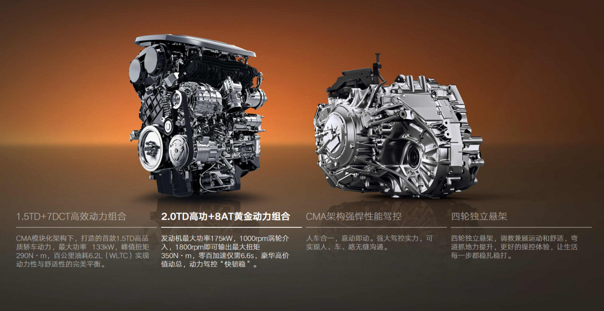 在动力性能上,星瑞东方曜更是毫不逊色。它搭载了2.0TD高功+爱信8AT高性能动总,最大功率175kW,峰值扭矩350N•m,澎湃动力,无论低速路段频繁启停,还是高速路段提速,都能快人一步。而CMA独有线控底盘、前麦弗逊+后多连杆独立悬架等豪华配置,更是让驾驶者感受到赛车级的制动性能和卓越的操稳性能。