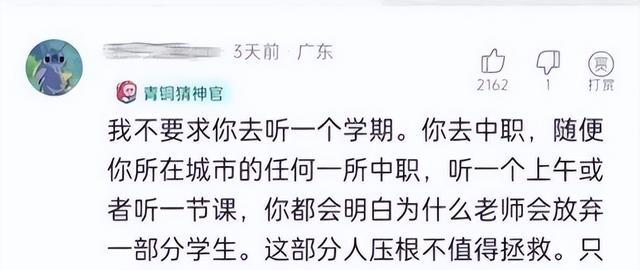 “我不要求你去听一个学期,你去中职,随便你所在城市的任何一所中职,听一个上午或者听一节课,你都会明白老师为什么会放弃一部分学生。”