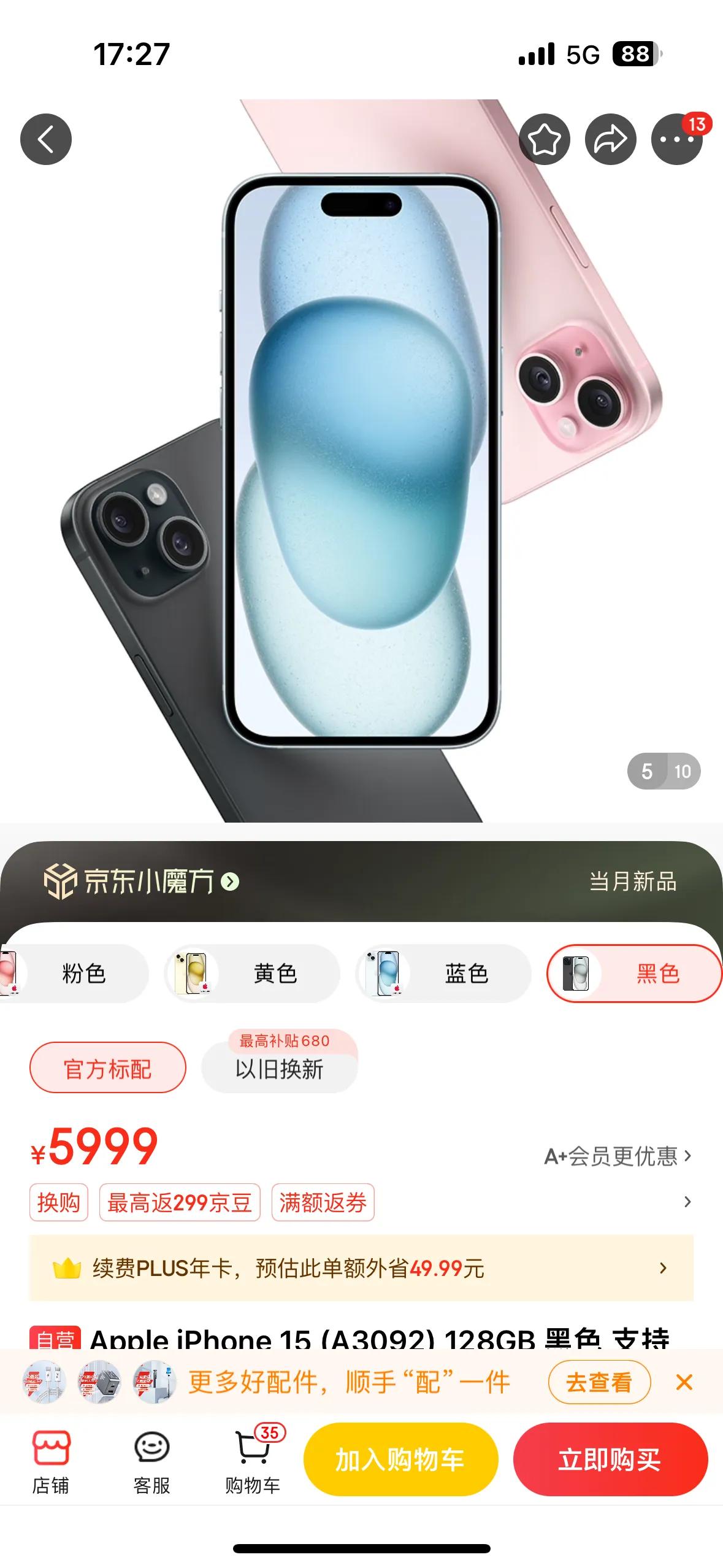 果然被我猜对了,iPhone15最近又涨价了 拿128G的丐版iPhone15来说 1:目前某东、某宝、官方都已经恢复了5999元的原价 2:多多目前最低4888元可以入手,不过只有粉色 之前我也说过,不到5000块钱买iPhone15还算可以,但是超过5000就没什么性价比了。所以最近并不是买iPhone15的好时机,真的想买可以等等双十二。 至于为什么超过5000就不值得买了呢?很简单,因为现在的国产手机真的强,差不多价位的有华为mate60、小米14Pro这些旗舰手机,像什么骁龙8gen3、2K屏幕,快充都有。 而且甚至一些价格更低的手机,一些体验也要更好,拿即将发布的#OPPO Reno11# 来说,定位中端旗舰,天玑8200和骁龙8+性能不错,日常使用挺流畅,但是最重要的还是它的拍照,拍照一直是OPPO的强项,这次reno11算是同价位无敌了,搭载一个3200万的单反级别人像镜头,加上find系列的高端调教,拍照真的是可以和单反比一比了。 所以现在买手机可选择的太多了,iPhone15性价比越来越低