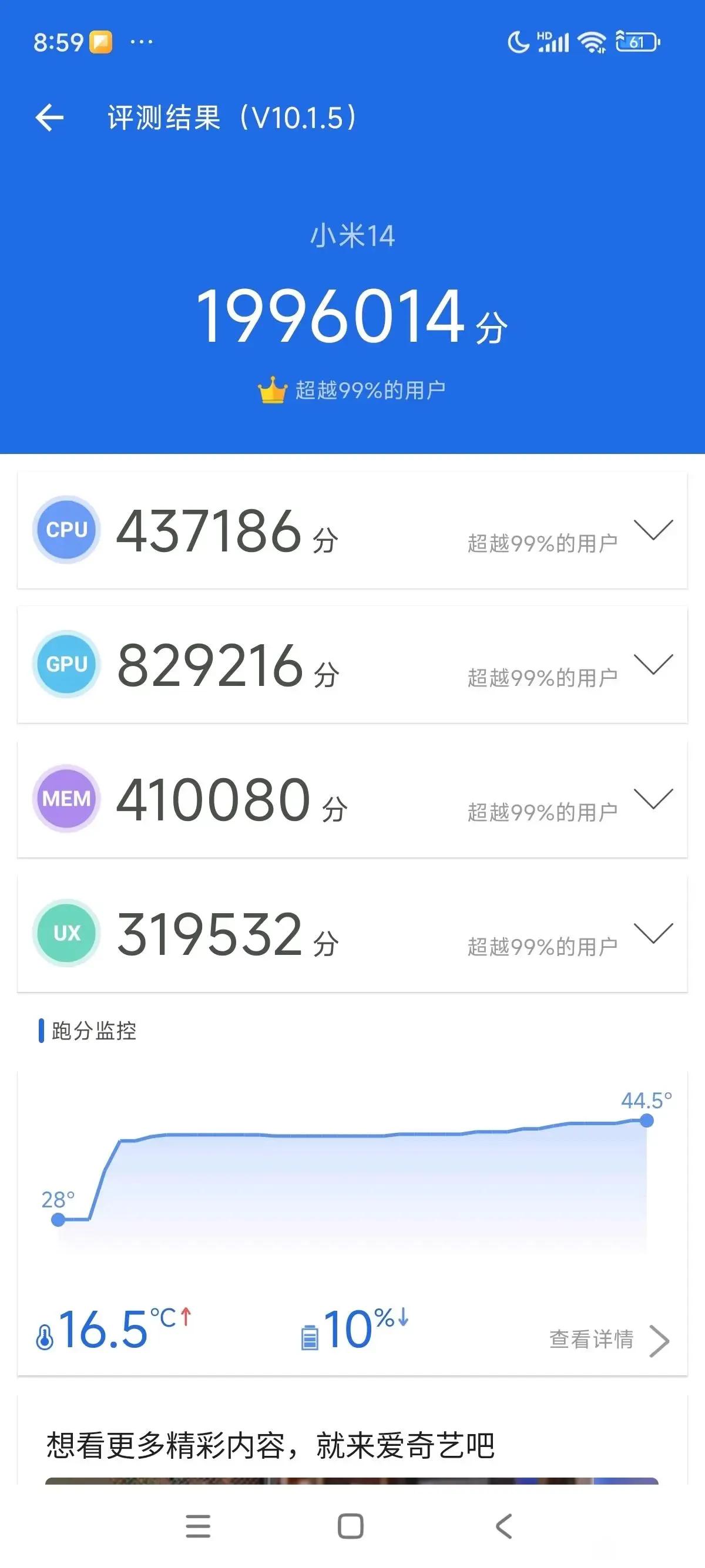 小米9替换成小米14了 手感都带壳没差别,就是变厚了一点,小米14的设计本身就是那种偏硬朗的风格,看着也精致一点。 续航史诗级提升,之前米9一天两到三充,但是14用到下班还有电!虽然是小手机但是续航是真的好。 跑分好像到200万有点困难,跑两次都是199万,估计刚拿到跑分会高一些,但是平时用下来还是很流畅的,没有出现过卡顿,而且终于可以打游戏了,开到最高画质也不会烫手。 另外像莱卡拍照,ip68防水这些高级功能,给它打99分!