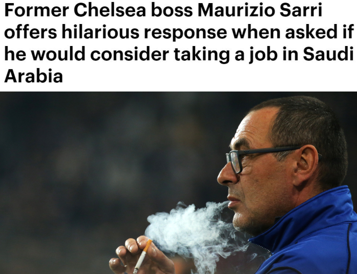 英国媒体邮报报道,前切尔西主帅、现拉齐奥主帅萨里被问到是否会去沙特工作时,用开玩笑的方式进行了回答。