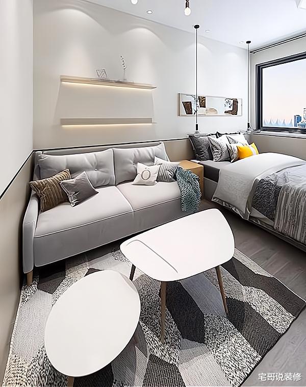 因为是一个人住,所以客厅和卧室之间没有设计隔断,大家装修的时候如果要考虑私密性,可以在中间做个帘子隔断一下。