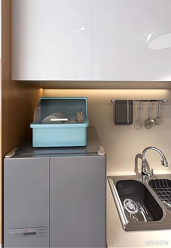 橱柜太小,摆不下碗柜,所以在冰箱上方摆放一个收纳盒收纳碗筷等餐具。橱柜上方没有切菜的操作台面,冰箱上面也可以充当这个功能区。