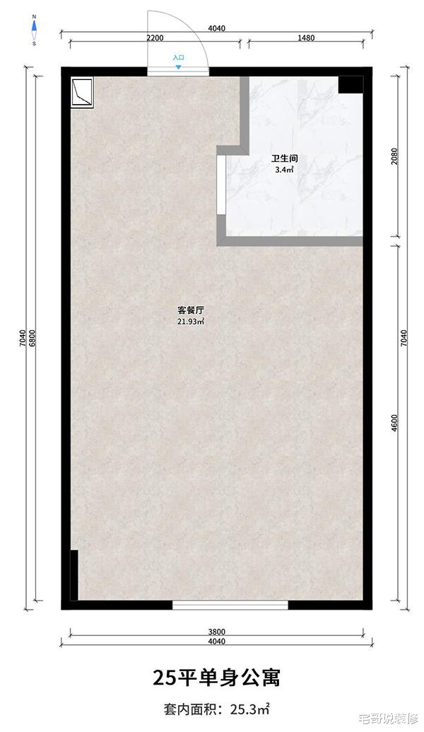 先来看看户型图,本案例公寓室内宽3.8米、长6.8米、层高2.8米,套内面积25.3平方米。业主是位90年的单身的小姐姐,一个人住,希望装修得简单点,厨房、卫生间、卧室、客厅、书桌、衣柜这些一样都不能少。